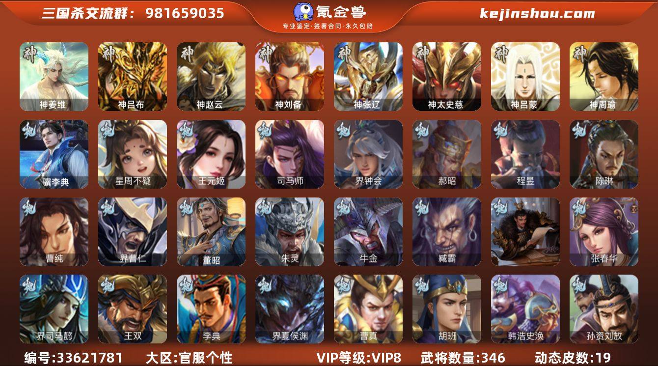 VIP等级: VIP8 官阶: 大将军 武将数量: 346 动态皮肤数量: 19 神将: 神刘备,神吕布,神太史慈,神张辽,神赵云,神吕蒙,神周瑜,神姜维 魏国武将: 曹纯,陈琳,程昱,郝昭,界钟会,司马师,王元姬,徐庶,张辽,SP蔡文姬,SP曹仁,SP关羽,SP贾诩,SP姜维,SP庞德,曹昂,曹操,曹冲,曹洪,曹丕,曹仁,曹叡,王异,张恭,鲁芝,界满宠,曹休,界曹植,满宠,荀攸,王基,钟繇,蒯越蒯良,郭嘉,牵招,荀彧,阮慧,界郭嘉,崔琰,界荀彧,朱灵,界甄姬,吕虔,界陈群,界王异,界许褚,界郭淮,陈群,界典韦,界曹休,袁涣,李通,乐进,辛宪英,郭淮,界曹彰,郭皇后,夏侯惇,曹植,司马朗,谋于禁,界曹操,星周不疑,许褚,界张辽,谋徐晃,张郃,钟会,文聘,曹彰,界夏侯惇,诸葛诞,司马懿,甄姬,徐晃,界曹仁,孙资刘放,韩浩史涣,胡班,曹真,典韦,界夏侯渊,夏侯渊,李典,于禁,王双,邓艾,界司马懿,张春华,孟达-魏,臧霸,牛金,朱灵(国战),董昭,骥李典 蜀国武将: 董允,谯周,沙摩柯,诸葛瞻,谋马超,谋赵云,徐庶,界魏延,杨仪,吕凯,界关羽,界诸葛亮,界伊籍,费祎,严颜,界黄月英,界张嶷,赵云,张松,彭羕,李丰,界刘备,刘封,黄月英,关羽,吴懿,吴班,界廖化,祝融,张飞,黄皓,陈震,魏延,界周仓,马忠,界法正,糜夫人,刘禅,界赵云,关银屏,界祝融,SP孙尚香,SP徐庶,卧龙诸葛,周...