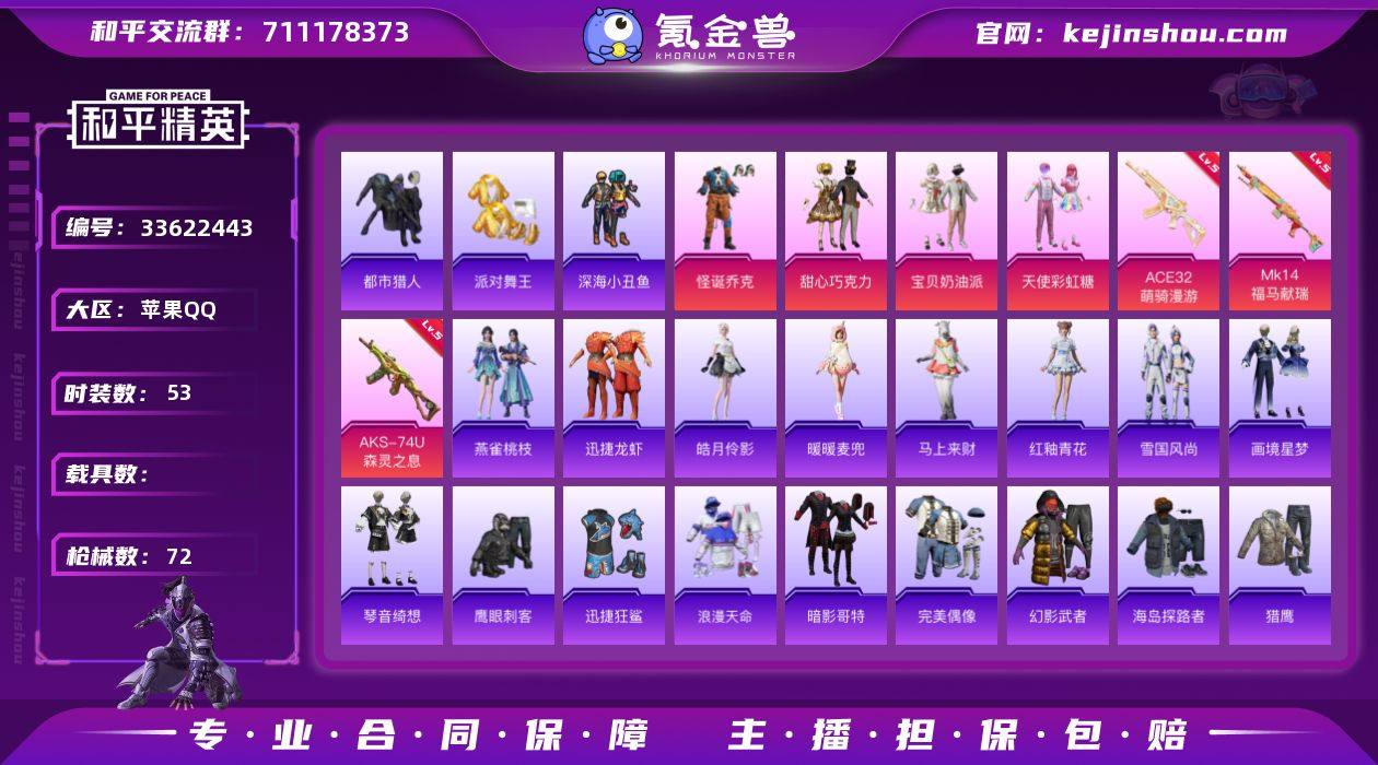 YZJ17082-不可二次-苹果Q-4稀有4粉装3特效枪6热门【精品身法素材号 伤感小雾神套装 小丑 巧克力三姐妹 都市 金鞋 双马尾 红眼罩 天命 鲨鱼裤 暖暖麦兜 菠萝头 小丑背包 4款飞行器】53套装72枪皮 20350热力值 3印记 历史绝世王牌15星 【4稀有】 都市猎人 浪漫天命 派对舞王 派对舞王(金靴子) 【4粉装】 宝贝奶油派 天使彩虹糖 甜心巧克力 怪诞乔克 【3特效枪】 AKS-74U-森灵之息 (5级) Mk14-福马献瑞 (5级) ACE32-萌骑漫游 (5级) 【6热门】 鹰眼刺客 迅捷狂鲨 深海小丑鱼 暗影哥特 漫步者 破蛋小黄鸡 【1头盔】 甜心宝贝头盔 【2背包】 甜心宝贝背包 深海小丑鱼背包 营地ID:1004211942