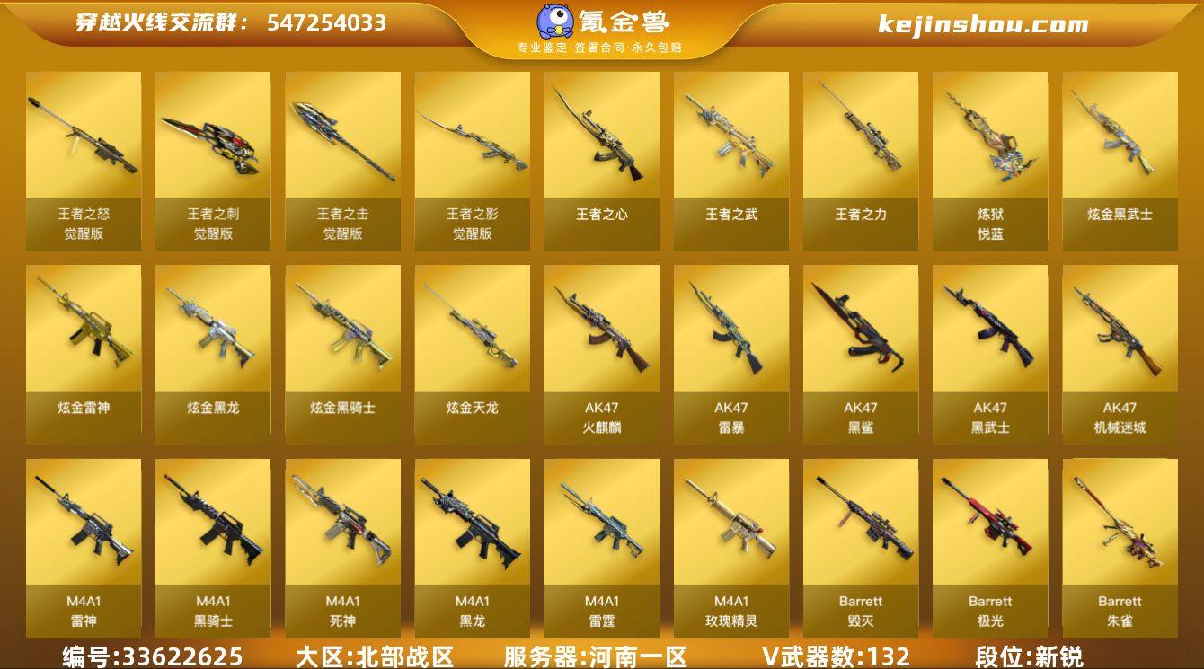 【ky6995】河南一区-141V-10王者武器数-5炫金武器数 【热门武器】:QBZ03-金色蔷薇*2,死亡之眼,M4A1-黑骑士*3,汤姆逊-烈龙*7,RPK-盘龙*4,加特林-炼狱*4,斯泰尔-蝴蝶,降世魔童,USP-雷暴,沙鹰-修罗*2 【王者炫金武器】:王者之武,王者之心,王者之力,炼狱-悦蓝,炫金骑士,炫金黑龙,炫金雷神,炫金武士,炫金天龙 【音效卡】:AK47-火麒麟音效卡,M4A1-雷神音效卡,M4A1-黑骑士音效卡,Barrett-毁灭音效卡 【皮肤】:雷神-暗月,雷神-星空,雷神-虎将,火麒麟-冠军之心,火麒麟-轻羽皮肤,毁灭耀金皮肤,毁灭-星空,毁灭-AG-CFPLS15冠军,战神-粉色甜心皮肤,战神-紫绶金章皮肤*4,战神-流金岁月皮肤*2,极光-能量核心,修罗-冠军之魂 【角色】:魅影,炫,春,王者-零,空,风暴女,新娜塔莎,影武者-X 【人偶武器】:天龙-曼陀罗,斯泰尔-蝴蝶,COP-旗袍,迷你生化手雷,闪光弹-小乔,降世魔童 【暴走生化】:死亡之眼 【挑战大师】:神圣爆裂者III,激光毁灭者III,阐释者III 【英雄级武器】:AK47-火麒麟*7,M4A1-黑龙,M4A1-雷神*2,M4A1-黑骑士*3,M4A1-死神,AK47-黑武士,AK12-天启,AN94-超新星,AK47-机械迷城*2,AK47-黑鲨*3,M4A1-雷霆,AK47-雷暴,QBZ...