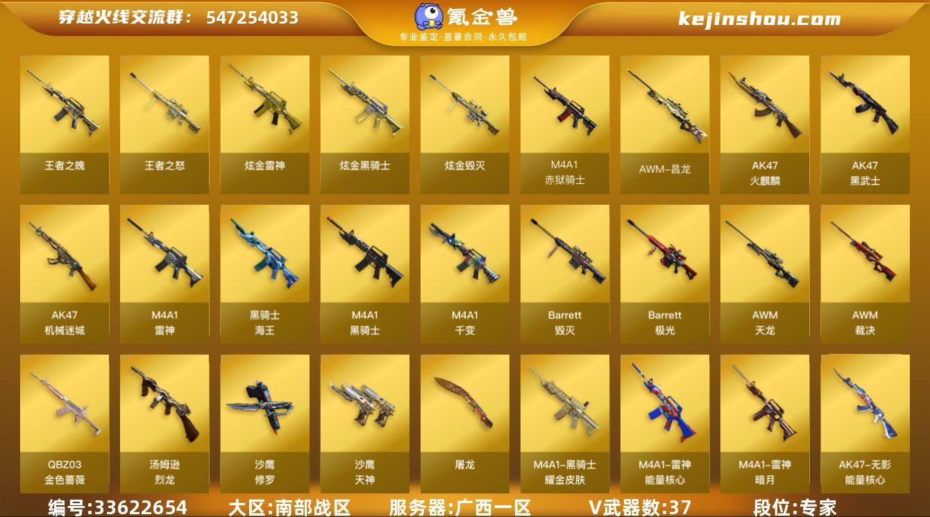 【ky6996】广西一区-39V-2王者武器数-3炫金武器数 【热门武器】:QBZ03-金色蔷薇*2,死亡之眼*3,M4A1-黑骑士,汤姆逊-烈龙*6,沙鹰-修罗*5 【王者炫金武器】:王者之魄,王者之怒,炫金骑士,炫金雷神,炫金毁灭 【皮肤】:雷神-暗月,雷神-能量核心,毁灭-英雄计划 皮肤,黑骑士耀金皮肤,无影-能量核心,天龙-能量核心,极光-能量核心,修罗-能量核心 【角色】:葵,战地猎狐,王者-零,初恋灵狐,风暴女,嘉年华灵狐,娟娟,潘多拉-X,铁骑荣耀 【人偶武器】:夺魂,迷你生化手雷,AK47-斯沃特 【暴走生化】:死亡之眼*3,超级对讲机 【英雄级武器】:M4A1-千变,AK47-火麒麟,M4A1-雷神,M4A1-黑骑士,AK47-黑武士*2,AK47-机械迷城,QBZ03-金色蔷薇*2,黑骑士-海王,AWM-天龙*2,Barrett-毁灭*2,Barrett-极光*2,AWM-裁决,汤姆逊-烈龙*6,沙鹰-修罗*5,沙鹰-天神,屠龙*7,M4A1-赤狱骑士,AWM-昌龙 【其他武器】:源-千变,源·火麒麟,御·火麒麟-平天大圣,源·雷神*4,御·雷神-葫芦兄弟,源·黑骑士,源·无影,源-金色蔷薇*2,源·毁灭,魂·毁灭-神秘黑洞,魂·炼狱-电子连击,魂·炼狱-玩具枪,源·天神,魂·天神-宇航兔兔,魂·龙啸-玩具枪 【道具】:炫彩背包,热带奇洋...