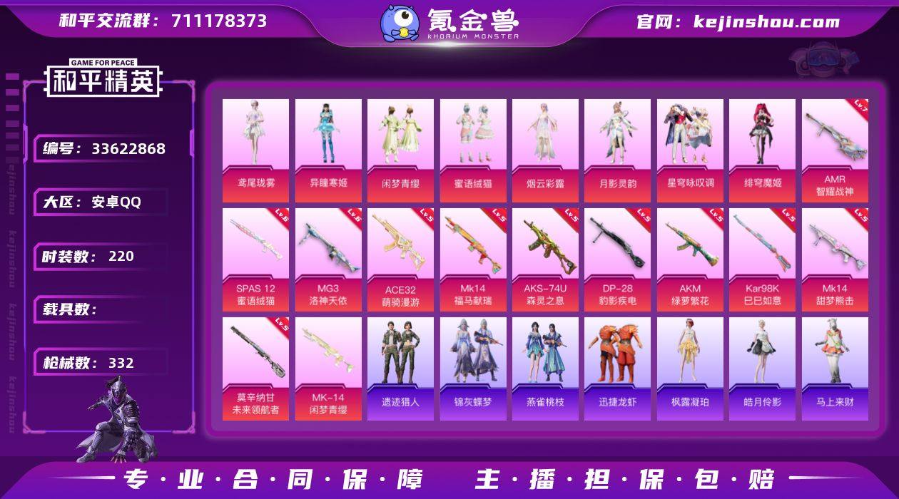 【kyhp1838】安卓 手Q-8粉装-12特效枪-0载具-3粉色飞行器-99972热力值-15王牌印记-220套装-332枪皮 【热门品类】:套装-龟仙人,角色-Mark.06 【粉色套装】:粉装-闲梦青缨,粉装-蜜语绒猫,角色-烟云彩露,角色-月影灵韵,粉装-星穹咏叹调,角色-绯穹魔姬,角色-异瞳寒姬,角色-鸢尾珑雾 【粉色枪皮等级】:AKM-绿萝繁花(五级),ACE32-萌骑漫游(五级),AKS-74U-森灵之息(五级),Kar98K-巳巳如意(五级),Mk14-甜梦熊击(五级),Mk14-福马献瑞(五级),莫辛纳甘-未来领航者(五级),AMR-智耀战神(七级),SPAS-12-蜜语绒猫(六级),DP-28-豹影疾电(五级),MG3-洛神天依(六级) 【粉色枪皮】:AKM-绿萝繁花,ACE32-萌骑漫游,AKS-74U-森灵之息,Kar98K-巳巳如意,Mk14-闲梦青缨,Mk14-甜梦熊击,Mk14-福马献瑞,莫辛纳甘-未来领航者,AMR-智耀战神,SPAS-12-蜜语绒猫,DP-28-豹影疾电,MG3-洛神天依 【粉色飞行器】:炫彩糖果飞行器,灵猫魔法师飞行器,云梦轻舟飞行器 【粉色降落伞】:绝对恒星降落伞,洛神天依降落伞,橘柚倾心降落伞,歌者泠鸢降落伞,音爆索尼克降落伞,纯梦嫁纱降落伞,白勺歌姬降落伞,闲梦青缨降落伞,蜜语绒猫降落伞,精灵梦叶罗丽降落伞,守护天翼降落伞,初...