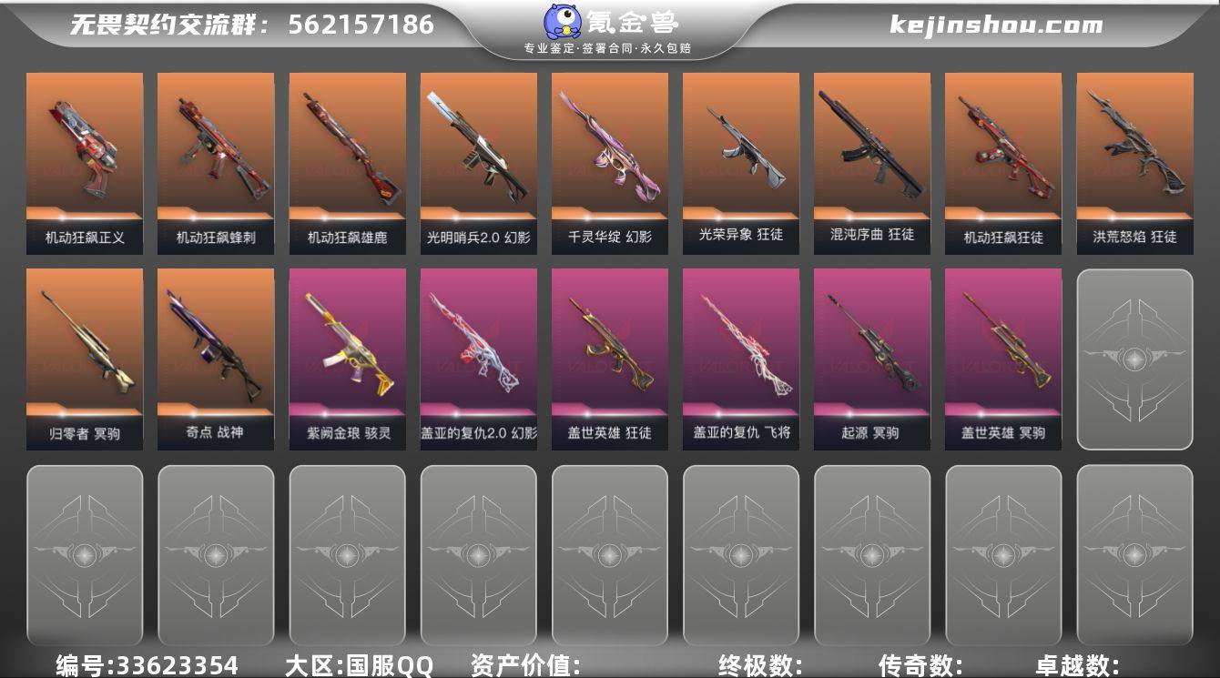 【充了快5千性价比高支持小刀】 【套装】:机动狂飙套装 【英雄】:幻棱,炼狱,维斯,暮蝶,钛狐,壹决,铁臂,捷风,雷兹,幽影,不死鸟,贤者,猎枭,蝰蛇,零,芮娜,奇乐,尚勃勒,霓虹,斯凯,夜露,星礈,K/O,海神,盖可,黑梦,钢锁 【近战武器】:近战武器-剥皮小刀,近战武器-RGX 11z Pro//3.0 爪刀,近战武器-澄湖潋滟,近战武器-超能偶像 应援棒,近战武器-超限闪存 匕首,近战武器-机动狂飙 战刀,近战武器-魄月玄刃,近战武器-沙尘幻旅 匕首,近战武器-日耀风暴 遗器 【狂徒】:狂徒-洪荒怒焰,狂徒-混沌序曲,狂徒-机动狂飙,狂徒-塑水宗,狂徒-光荣异象,狂徒-盖世英雄,狂徒-超能偶像,狂徒-钢轨卫士,狂徒-弧光异彩,狂徒-沙尘幻旅,狂徒-永恒之砂 【幻影】:幻影-光明哨兵//2.0,幻影-千灵华绽,幻影-盖亚的复仇//2.0,幻影-超限闪存,幻影-浪漫雪国,幻影-聚合之力,幻影-战术小伙伴 【戍卫】:戍卫-超能偶像,戍卫-钢轨卫士,戍卫-彩梦之城,戍卫-浮光跃金,戍卫-萌彩剪影 【獠犬】:獠犬-弧光异彩,獠犬-采蜜小蜂队,獠犬-胡桃狂想,獠犬-模拟赫兹,獠犬-战术小伙伴 【冥驹】:冥驹-归零者,冥驹-盖世英雄,冥驹-起源,冥驹-胡桃狂想,冥驹-模拟赫兹...
