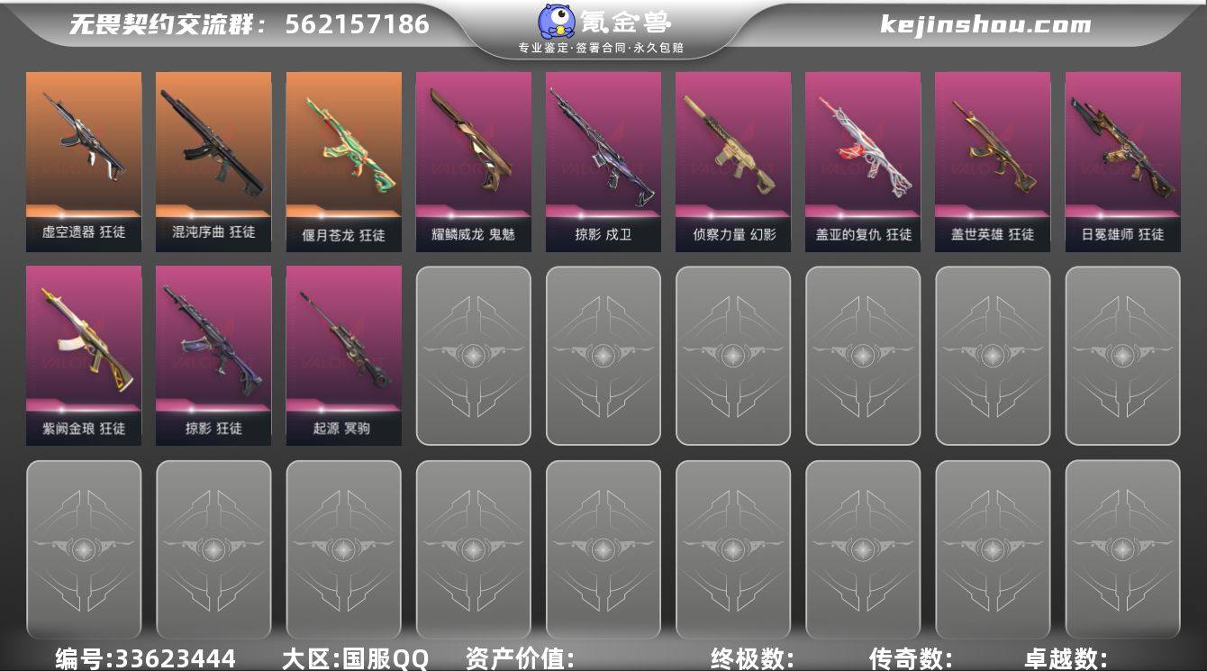 【充值快7k皮肤多优质!可小刀】 【套装】:虚空遗器套装,西部未来套装,奇点//2.0套装,般若假面//2.0套装,掠影套装 【英雄】:幻棱,炼狱,维斯,暮蝶,钛狐,壹决,铁臂,捷风,雷兹,幽影,不死鸟,贤者,猎枭,蝰蛇,零,芮娜,奇乐,尚勃勒,霓虹,斯凯,夜露,星礈,K/O,海神,盖可,黑梦,钢锁 【近战武器】:近战武器-奇点//2.0 蝴蝶刀,近战武器-紫金爪刀,近战武器-RGX 11z Pro//3.0 爪刀,近战武器-鬼丸国纲,近战武器-源始幻刃,近战武器-未来开拓者,近战武器-超限闪存 匕首,近战武器-荒土机兵 热能刀,近战武器-天玄刀,近战武器-影刃,近战武器-神圣领域 战刀 【狂徒】:狂徒-混沌序曲,狂徒-奇点//2.0,狂徒-塑水宗,狂徒-偃月苍龙,狂徒-虚空遗器,狂徒-般若假面//2.0,狂徒-掠影,狂徒-盖世英雄,狂徒-盖亚的复仇,狂徒-日冕雄师,狂徒-紫阙金琅,狂徒-荒土机兵,狂徒-诡秘蛇影 【幻影】:幻影-西部未来,幻影-虚空遗器,幻影-侦察力量,幻影-超限闪存,幻影-神圣领域,幻影-纳米打击,幻影-西部未来 【戍卫】:戍卫-掠影,戍卫-浮光跃金,戍卫-逆冲蛮牛,戍卫-月球哨兵,戍卫-折光棱晶 【獠犬】:獠犬-般若假面//2.0,獠犬-神圣领域,獠犬-模拟赫兹,...