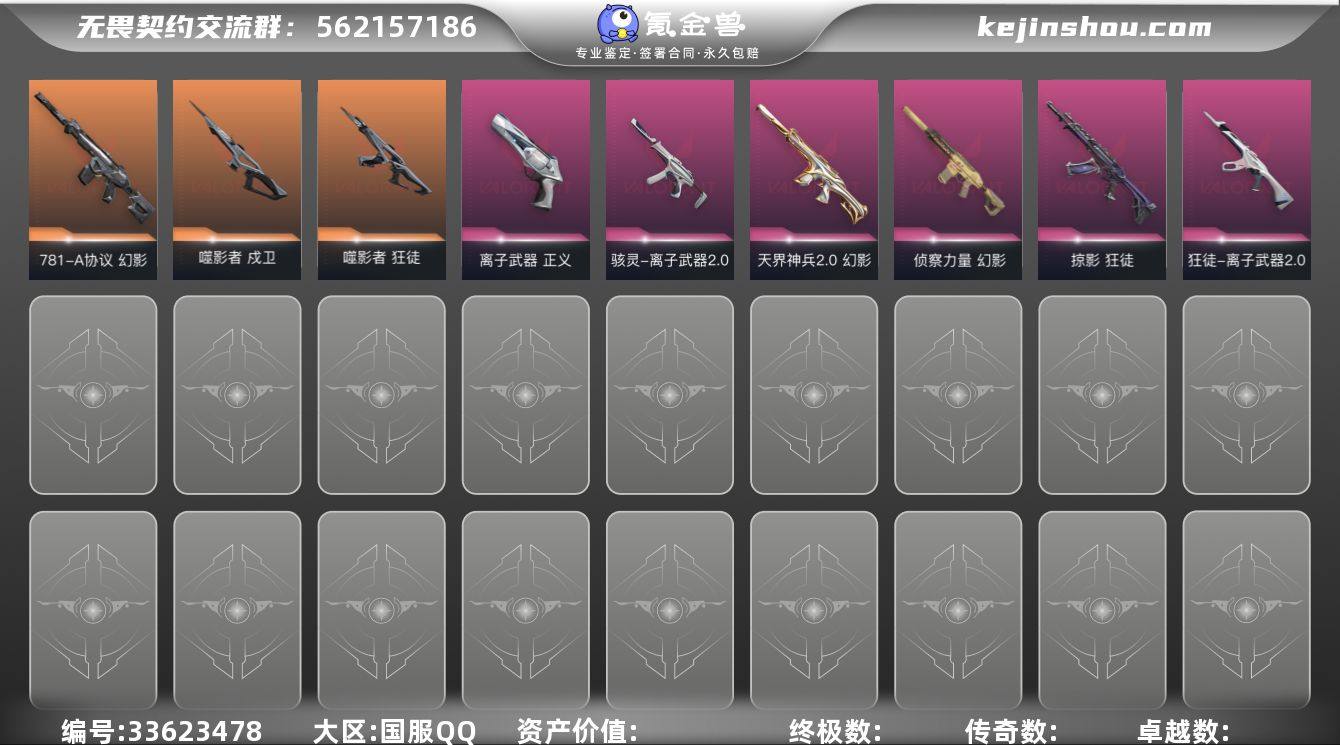【套装】:噬影者套装,离子武器//2.0套装 【英雄】:幻棱,炼狱,维斯,暮蝶,钛狐,壹决,铁臂,捷风,雷兹,幽影,不死鸟,贤者,猎枭,蝰蛇,零,芮娜,奇乐,尚勃勒,霓虹,斯凯,夜露,星礈,海神,盖可,黑梦,钢锁 【近战武器】:近战武器-噬影者 簇刃,近战武器-离子武器//2.0 爪刀,近战武器-日耀风暴 遗器 【狂徒】:狂徒-创·纪元,狂徒-噬影者,狂徒-掠影,狂徒-离子武器//2.0,狂徒-诡秘蛇影 【幻影】:幻影-781-A协议,幻影-天界神兵//2.0,幻影-侦察力量,幻影-神圣领域,幻影-末日之翼 【戍卫】:戍卫-噬影者,戍卫-月球哨兵,戍卫-折光棱晶 【獠犬】:獠犬-神圣领域 【飞将】:飞将-末日之翼 【莽侠】:莽侠-诡秘蛇影,莽侠-月球哨兵 【战神】:战神-离子武器//2.0,战神-神圣领域 【奥丁】:奥丁-末日之翼 【判官】:判官-诡秘蛇影 【雄鹿】:雄鹿-月球哨兵 【骇灵】:骇灵-离子武器//2.0,骇灵-星云暗涌 【蜂刺】:蜂刺-噬影者,蜂刺-星云暗涌,蜂刺-折光棱晶 【标配】:标配-折光棱晶 【VCT手枪】:标配-VCT25 x TEC 【正义】:正义-离子武器,正义-月球哨兵 【鬼魅】:鬼魅-噬影者 【狂怒】:狂怒-离子武器//2.0,狂怒-神圣领域 【短炮】:短炮-末日之翼...