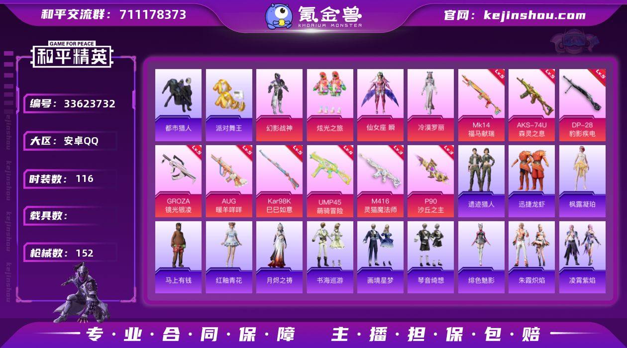 W16360 可立即换绑无需挂单养号 安卓 手Q-4粉装-9特效枪-0载具-5粉色飞行器-49776热力值-8王牌印记-116套装-152枪皮 【热门品类】:套装-浪漫天命,套装-都市猎人,套装-派对舞王,套装-小丑鱼,套装-龟仙人,套装-暗影哥特 【粉色套装】:粉装-幻影战神,粉装-炫光之旅,角色-仙女座 瞬,角色-冷漠罗丽 【粉色枪皮等级】:M416-灵猫魔法师(三级),GROZA-镜光银凌(五级),AUG-暖羊咩咩(五级),UMP45-萌骑冒险(四级),AKS-74U-森灵之息(五级),P90-沙丘之主(三级),Kar98K-巳巳如意(五级),Mk14-福马献瑞(五级),DP-28-豹影疾电(五级) 【粉色枪皮】:M416-灵猫魔法师,GROZA-镜光银凌,AUG-暖羊咩咩,UMP45-萌骑冒险,AKS-74U-森灵之息,P90-沙丘之主,Kar98K-巳巳如意,Mk14-福马献瑞,DP-28-豹影疾电 【粉色飞行器】:炫彩糖果飞行器,星之彼岸飞行器,曦光华影飞行器,灵猫魔法师飞行器 【粉色降落伞】:星之彼岸降落伞,沙丘之主降落伞,金蛇镇世降落伞,鬼刀降落伞,星穹咏叹调降落伞,无垠阁降落伞,异瞳寒姬降落伞,极意拳锋降落伞,炫彩糖果降落伞,罪夜之冕降落伞 【稀有套装】:套装-龟仙人,套装-巳巳如意,套装-马上有钱,套装-迅捷龙虾,套装-遗迹猎人,套装-糖...