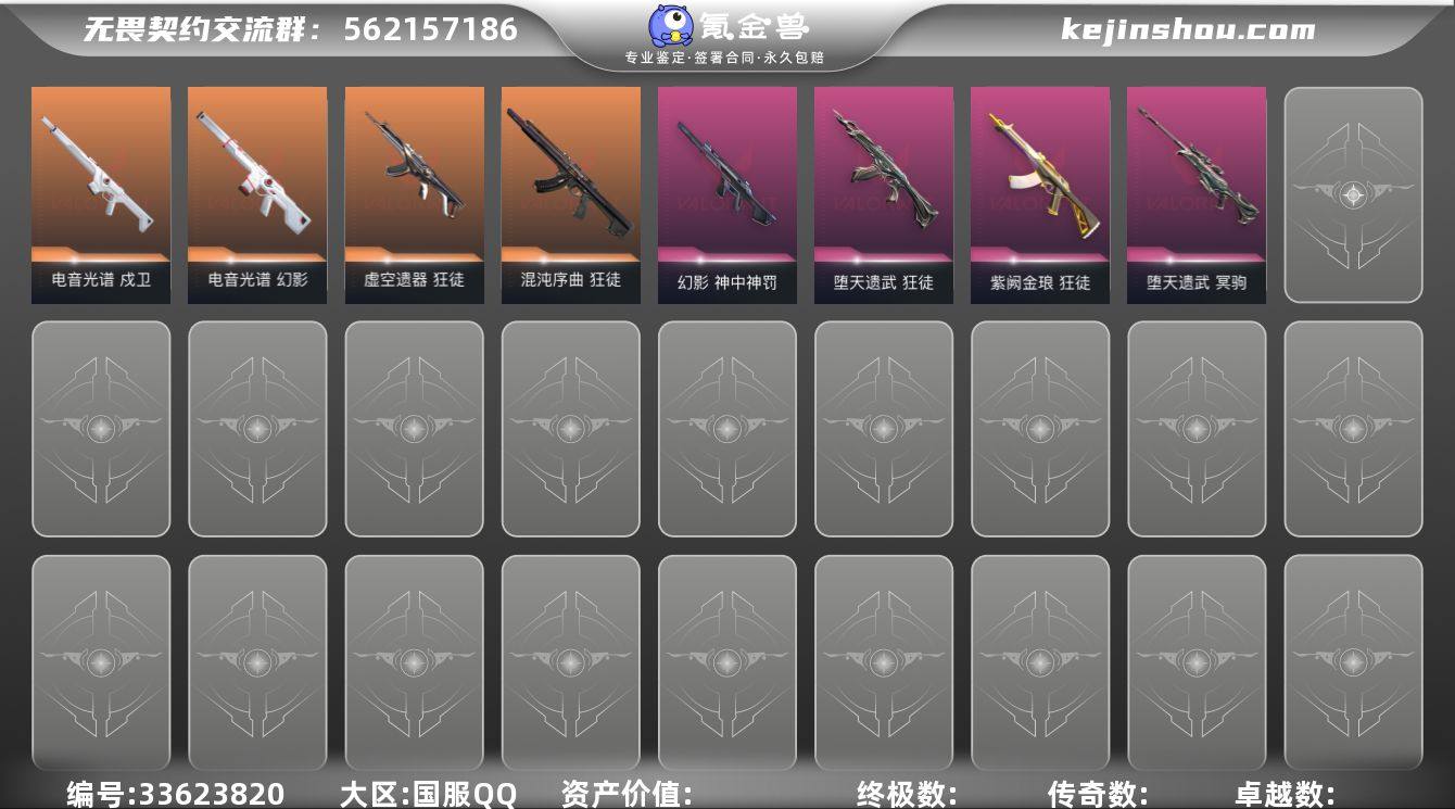 【套装】:电音光谱套装,西部未来套装,奇点//2.0套装,般若假面//2.0套装 【英雄】:幻棱,炼狱,维斯,暮蝶,钛狐,壹决,铁臂,捷风,雷兹,幽影,不死鸟,贤者,猎枭,蝰蛇,零,芮娜,奇乐,尚勃勒,霓虹,斯凯,夜露,星礈,K/O,海神,盖可,黑梦,钢锁 【近战武器】:近战武器-谐波音谱,近战武器-奇点//2.0 蝴蝶刀,近战武器-澄湖潋滟,近战武器-鬼丸国纲,近战武器-未来开拓者,近战武器-超能偶像 应援棒,近战武器-超限闪存 匕首,近战武器-诡秘蛇影 军刀,近战武器-神圣领域 战刀,近战武器-日耀风暴 遗器 【狂徒】:狂徒-混沌序曲,狂徒-奇点//2.0,狂徒-虚空遗器,狂徒-般若假面//2.0,狂徒-堕天遗武,狂徒-紫阙金琅,狂徒-超能偶像,狂徒-诡秘蛇影 【幻影】:幻影-西部未来,幻影-电音光谱,幻影-神中神罚,幻影-超限闪存,幻影-神圣领域,幻影-聚合之力,幻影-末日之翼,幻影-西部未来,幻影-电音光谱 【戍卫】:戍卫-电音光谱,戍卫-超能偶像,戍卫-浮光跃金,戍卫-月球哨兵,戍卫-折光棱晶,戍卫-电音光谱 【獠犬】:獠犬-电音光谱,獠犬-般若假面//2.0,獠犬-神圣领域,獠犬-采蜜小蜂队,獠犬-模拟赫兹,獠犬-电音光谱 【冥驹】:冥驹-堕天遗武,冥驹-模...