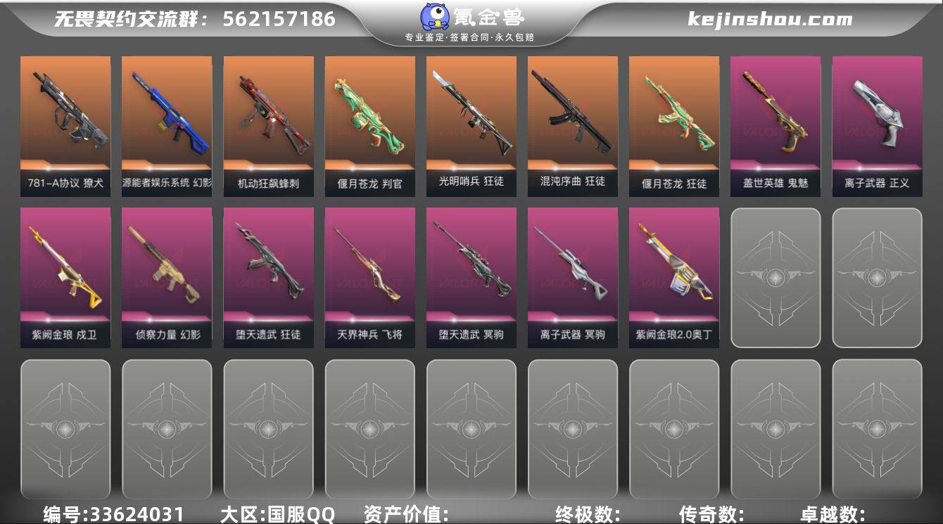 【充值3k多性价比十分高,可以小刀下,已经签合同找回永久赔】 【英雄】:幻棱,炼狱,维斯,暮蝶,钛狐,壹决,铁臂,捷风,雷兹,幽影,不死鸟,贤者,猎枭,蝰蛇,零,芮娜,奇乐,尚勃勒,霓虹,斯凯,夜露,星礈,K/O,海神,盖可,黑梦,钢锁 【近战武器】:近战武器-碎心裂刃,近战武器-剥皮小刀,近战武器-超能偶像 应援棒,近战武器-超限闪存 匕首,近战武器-天玄刀,近战武器-天御刀 【狂徒】:狂徒-光明哨兵,狂徒-混沌序曲,狂徒-偃月苍龙,狂徒-堕天遗武,狂徒-超能偶像,狂徒-荒土机兵 【幻影】:幻影-源能者娱乐系统,幻影-侦察力量,幻影-超限闪存,幻影-聚合之力,幻影-纳米打击 【戍卫】:戍卫-紫阙金琅,戍卫-超能偶像,戍卫-浮光跃金,戍卫-逆冲蛮牛 【獠犬】:獠犬-781-A协议,獠犬-采蜜小蜂队,獠犬-模拟赫兹,獠犬-逆冲蛮牛 【冥驹】:冥驹-堕天遗武,冥驹-离子武器,冥驹-荒土机兵,冥驹-模拟赫兹 【飞将】:飞将-天界神兵,飞将-聚合之力 【莽侠】:莽侠-超限闪存 【战神】:战神-采蜜小蜂队,战神-浮光跃金 【奥丁】:奥丁-紫阙金琅//2.0,奥丁-纳米打击 【判官】:判官-偃月苍龙,判官-超能偶像,判官-采蜜小蜂队,判官-纳米打击x 【雄鹿】:雄鹿-...