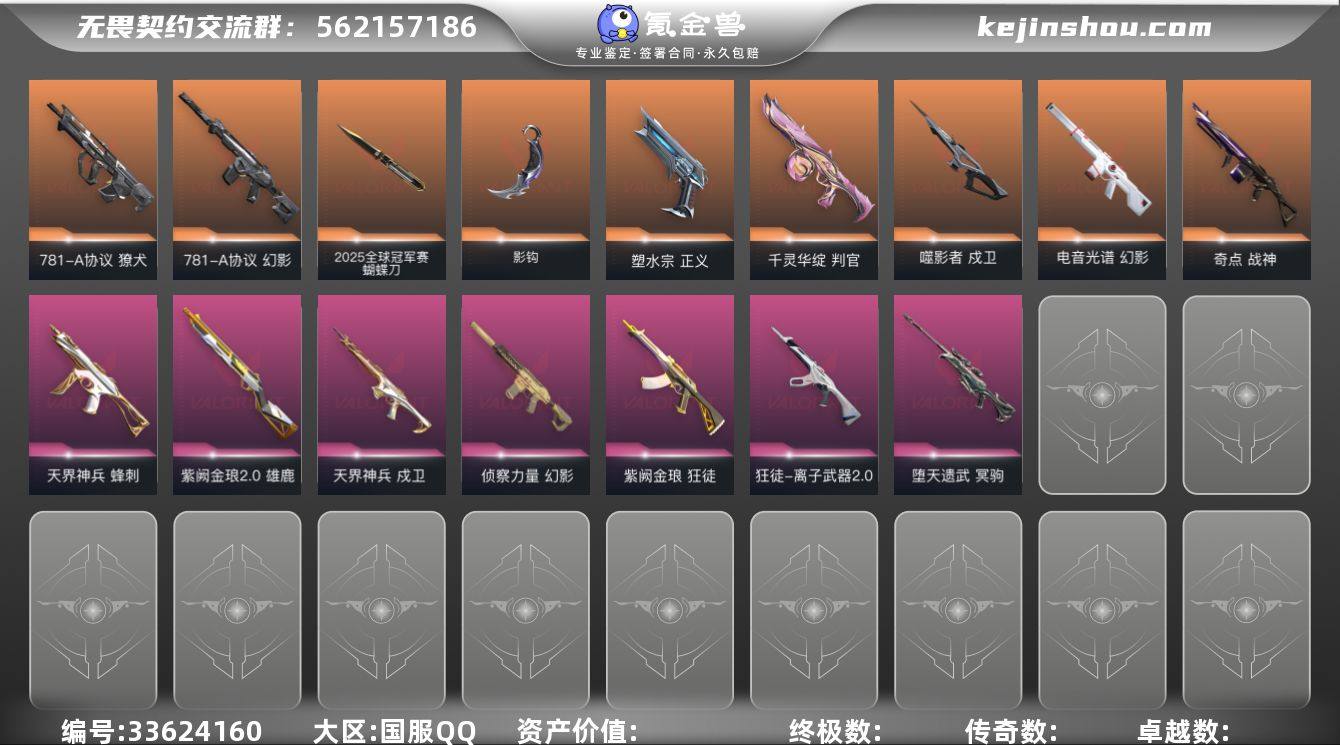 【套装】:2025全球冠军赛套装,2022全球冠军赛套装,掠影//2.0套装,英雄之选套装 【英雄】:幻棱,炼狱,维斯,暮蝶,钛狐,壹决,铁臂,捷风,雷兹,幽影,不死鸟,贤者,猎枭,蝰蛇,零,芮娜,奇乐,尚勃勒,霓虹,斯凯,夜露,星礈,K/O,海神,盖可,黑梦,钢锁 【近战武器】:近战武器-2025全球冠军赛 蝴蝶刀,近战武器-2022全球冠军赛 蝴蝶刀,近战武器-影钩,近战武器-黑波之刃,近战武器-落英飞旋,近战武器-威龙之刃,近战武器-定海神珍,近战武器-荒土机兵 热能刀,近战武器-诡秘蛇影 军刀,近战武器-神圣领域 战刀,近战武器-日耀风暴 遗器,近战武器-阿特拉斯指挥部 甩棍,近战武器-星际猎兵 短剑 【狂徒】:狂徒-2025全球冠军赛,狂徒-奇点//2.0,狂徒-RGX 11z Pro,狂徒-紫阙金琅,狂徒-离子武器//2.0,狂徒-荒土机兵,狂徒-诡秘蛇影 【幻影】:幻影-2022全球冠军赛,幻影-电音光谱,幻影-781-A协议,幻影-侦察力量,幻影-掠影//2.0,幻影-神圣领域,幻影-纳米打击,幻影-末日之翼,幻影-电音光谱 【戍卫】:戍卫-噬影者,戍卫-天界神兵,戍卫-逆冲蛮牛,戍卫-月球哨兵,戍卫-折光棱晶 【獠犬】:獠犬-781-A协议,獠犬-神圣领域,獠犬-逆冲蛮牛 【冥驹】:冥...