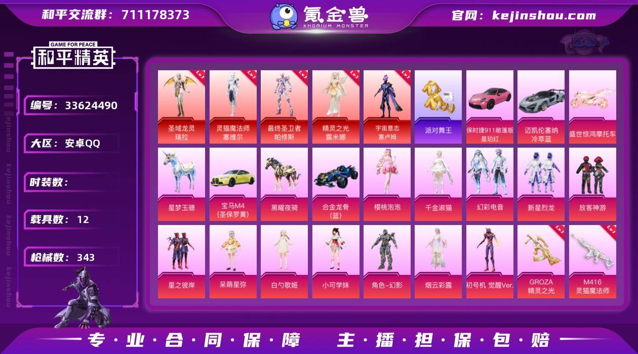 【氪金大佬专业号!5级红 灵猫 帕修斯 瑞拉 精灵 宇宙意志 金鞋 法拉利 放客 3级AUG星梦 8把计数枪 满地铁天赋】c30623-【可二次】【因赛季更新游戏段付以上号为准!】 安卓Q-5红装2稀有12载具13粉装28特效枪6热门169套装343枪皮 14印记 历史卓越王牌20星 【5红装】 灵猫魔法师-塞维尔 (1级) 最终圣卫者-帕修斯 (1级) 圣域龙灵-瑞拉 (1级) 精灵之光-露米娜 (1级) 宇宙意志-塞卢姆 (5级) 【2稀有】 派对舞王 派对舞王(金靴子) 【12载具】 法拉利Purosangue(纽博格林银) 保时捷911敞篷版(星珀红) 宝马M4(圣保罗黄) 纱华曳影 霜月冰狼 凌风神骏 九霄玄鹿 迈凯伦塞纳(冷萃蓝) 合金龙骨蓝色 黑曜夜骑 星梦玉骢 盛世惊鸿摩托车 【13粉装】 觉醒初号机 虹云熊熊 千金淑猫 烟云彩露 樱桃泡泡 白勺歌姬 呆萌星弥 小可学妹 幻影战神 幻彩电音 放客神游 新星烈龙 星之彼岸 【29特效枪】 AKM-暮色玫影 (3级) SCAR-L-金蛇镇世 (3级) SCAR-L-锦绣绵绵 (5级) SCAR-L-魔童闹海哪吒 (2级) M416-电玩时刻 (5级) M416-灵猫魔法师 (3级) P90-沙丘之主 (3级) AKM-炫紫旋律 (5级) AKS-74U-森灵之息 (5级) AKM-绿萝繁花 (5级) Kar98K-巳巳如意 (5级) Vector-最终圣卫者 (3级) M762-青锋波束 (5...