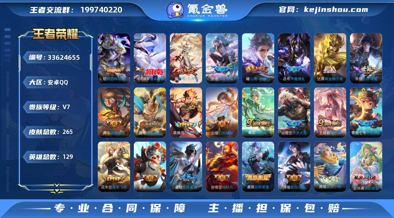 安卓Q-V7-永恒钻石II段位-129英雄-265皮肤-1典藏皮肤-1珍品传说-20传说-71史诗 【英雄全皮】:敖隐全皮 【荣耀典藏】:铠银白咏叹调 【珍品传说】:马可波罗怪盗基德 【传说皮肤】:澜愿照九州拓,云缨幻光神枪,裴擒虎祥瑞亨通,王昭君映山客,桑启鸣野蒿,亚连落雪白狼,典韦战鼓燎原,鲁班七号时之奇旅,吕布遇见神鼓,孙悟空齐天大圣,曜山海苍雷引,周瑜音你心动,虞姬启明星使,李信一念神魔,虞姬云霓雀翎,达摩黄金狮子座,花木兰冠军飞将,梦奇胖达荣荣,孙悟空地狱火,吕布天魔缭乱 【限定皮肤】:白起狰,姜子牙天穹之誓,狄仁杰阴阳师,虞姬凯尔特女王,赵云皇家上将,嬴政白昼王子,鲁班七号狮舞东方,鲁班七号时之奇旅,庄周高山流水,扁鹊炼金王,芈月重明,吕布天魔缭乱,吕布猎兽之王,吕布遇见神鼓,夏侯惇朔风刀,甄姬游园惊梦,曹操烛龙,典韦穷奇,典韦蓝屏警告,马可波罗山海玄木吟,狄仁杰魔术师,狄仁杰万华元夜,达摩沙漠行僧,项羽海滩派对,老夫子醍醐杖,老夫子航海奇遇记,关羽冰锋战神,程咬金演武夺筹,韩信逐梦之影,兰陵王金庭之子,花木兰青春决赛季,花木兰瑞麟志,孙悟空美猴王,孙悟空大圣娶亲,孙悟空齐天大圣,牛魔御旌,后羿辉光之辰...