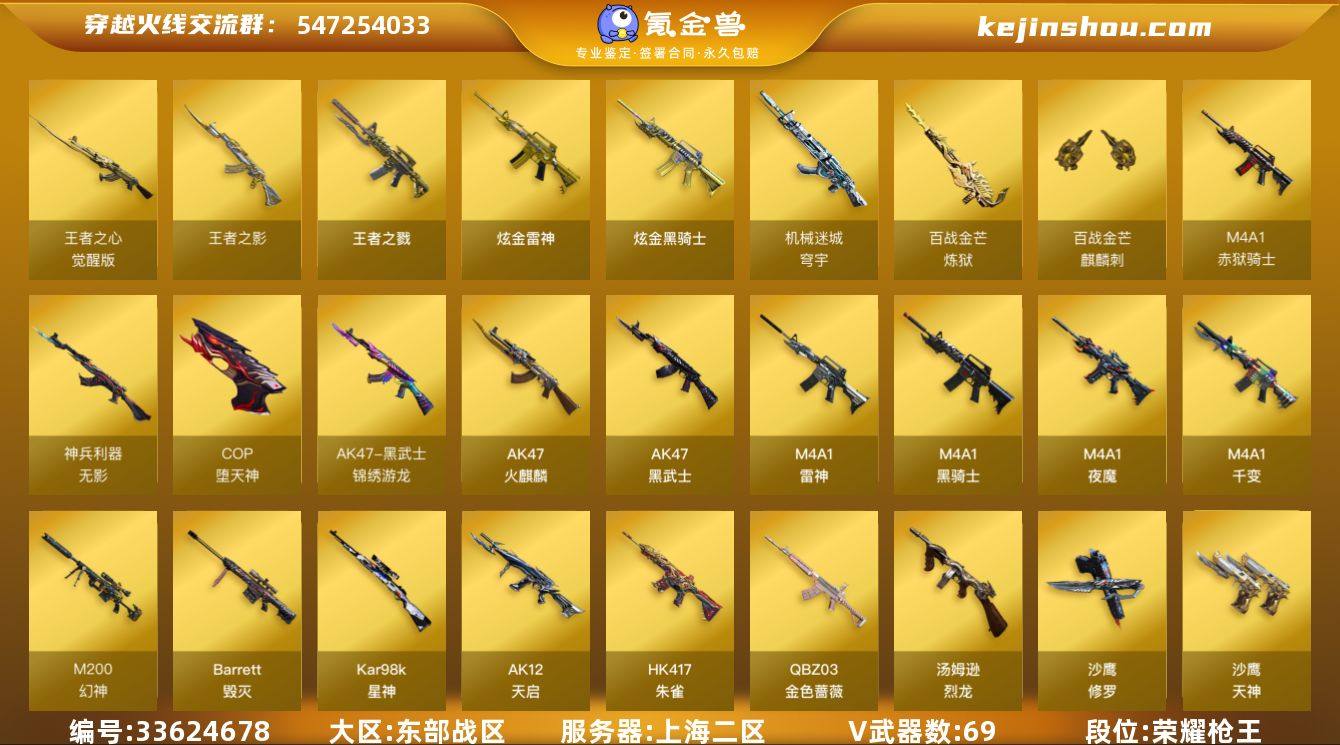 【ky7005】上海二区-75V-3王者武器数-2炫金武器数 【热门武器】:QBZ03-金色蔷薇,HK417-朱雀,M200-幻神,Kar98K-星神,M4A1-黑骑士,汤姆逊-烈龙*5,COP-堕天神,沙鹰-修罗*3 【王者炫金武器】:王者之戮,王者之影,炫金骑士,炫金雷神 【音效卡】:屠龙-电竞之星-竞星跃动音效卡,QBZ03-金色蔷薇-竞星跃动音效卡,M4A1-雷神音效卡,M4A1-黑骑士音效卡,Barrett-毁灭音效卡,HK417-朱雀-电竞之星-竞星跃动音效卡,Barrett-碧霄极光音效卡,炼狱-百战金芒-庆典舞曲音效卡 【皮肤】:雷神-暗月,雷神-虎将,雷神-源计划2.0专属 皮肤,M4A1-再燃火线,火麒麟-平天大圣,火麒麟-心动糖果,毁灭-英雄计划 皮肤,黑骑士-暗月,修罗-能量核心,轻型军用手斧-再燃火线 【角色】:零,葵,零·纪元,战地猎狐,王者-魅影,葵-阿尔法武装,幻面灵狐,斗烈龙骑,暗夜-X,初恋灵狐,飞虎队-X,风暴女,虎妞,嘉年华灵狐,娟娟,兰-新年限定,灵狐者-X,龙儿-小淘气,麻雀,潘多拉-X,青霞仙子,斯沃特-X,兔囡囡,雪莉杨,影武者-X,游珑儿,潘多拉-N 【人偶武器】:AWM-灵狐-15周年嘉年华*2,迷你牛牛,生化手雷-机甲核心 【暴走生化】:超级对讲机 【挑战大师】:神圣爆裂者III,冰龙...