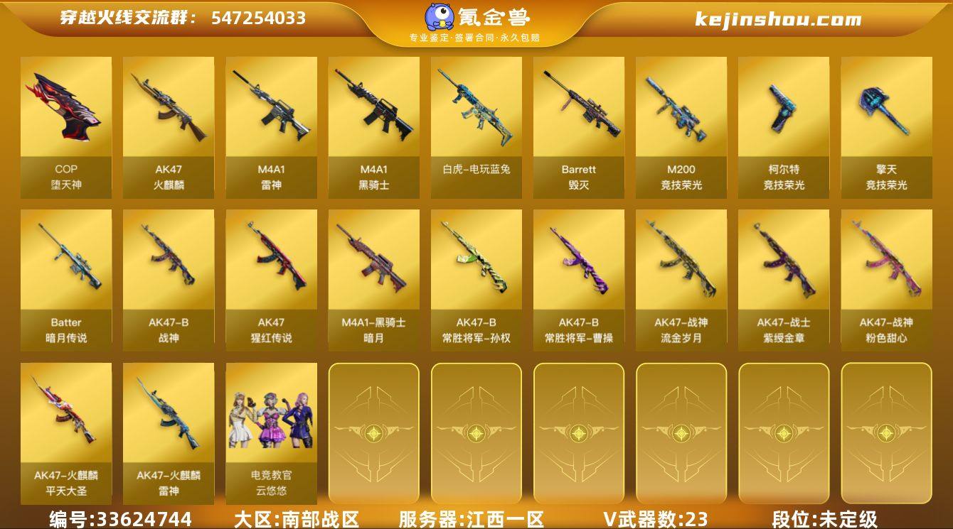江西一区-24V-0王者武器数-0炫金武器数 【热门武器】:M200-竞技荣光,白虎-电玩蓝兔,M4A1-黑骑士,裁决-雪莉杨,COP-堕天神 【皮肤】:火麒麟-雷神,火麒麟-平天大圣*2,黑骑士-暗月*2,战神-粉色甜心皮肤*2,战神-紫绶金章皮肤,战神-流金岁月皮肤,AK47-B-常胜将军-曹操,AK47-B-常胜将军-孙权 【角色】:电竞教官-云悠悠,初恋灵狐,芳心审判者,风暴女,虎妞,嘉年华灵狐,灵狐者-七夕宝贝,龙儿,麻雀,潘多拉-X,斯沃特-X,兔囡囡 【人偶武器】:裁决-雪莉杨,夺魂,迷你超能女侍 【挑战大师】:冰龙粉碎者-白马银枪*2,激光毁灭者III-白马银枪,激光毁灭者III 【英雄级武器】:AK47-火麒麟,M4A1-雷神,M4A1-黑骑士,AK-47-猩红传说,AK47-B-战神*2,白虎-电玩蓝兔,Barrett-毁灭,M200-竞技荣光,Barrett-暗月传说*2,COP-堕天神,柯尔特-竞技荣光,擎天-竞技荣光*2,高爆手雷-竞技荣光*3,闪光弹-竞技荣光*2,烟雾弹-竞技荣光*3 【其他武器】:源-千变,御·火麒麟-平天大圣,火麒麟-雷神,御·黑龙-龙太子,魂·雷神-维纳斯,魂-雷神-萌杀,御·雷神-机甲刑天,御·雷神-烈虎*3,M4A1-十二生肖·龙-雷神,雷神-赛博幻想,源·黑骑士,魂·黑骑士-现代金属*3,魂·黑骑士-幻...