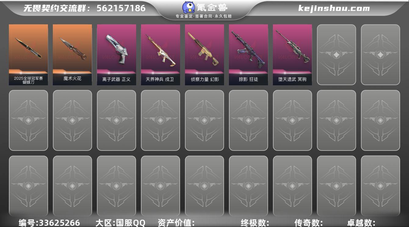 【套装】:2025全球冠军赛套装,VCT 2026 赛季套装 【英雄】:幻棱,炼狱,维斯,暮蝶,钛狐,壹决,铁臂,捷风,雷兹,幽影,不死鸟,贤者,猎枭,蝰蛇,零,芮娜,奇乐,尚勃勒,霓虹,斯凯,夜露,星礈,K/O,海神,盖可,黑梦,钢锁 【近战武器】:近战武器-2025全球冠军赛 蝴蝶刀,近战武器-VCT 2026 篆刀,近战武器-魔术火花,近战武器-离子武器//2.0 爪刀,近战武器-魔术火花 【狂徒】:狂徒-2025全球冠军赛,狂徒-塑水宗,狂徒-超时空卫队,狂徒-掠影 【幻影】:幻影-侦察力量 【戍卫】:戍卫-天界神兵 【冥驹】:冥驹-堕天遗武 【莽侠】:莽侠-RGX 11z Pro//3.0 【骇灵】:骇灵-无限竞技 【正义】:正义-离子武器,正义-纳米打击 【鬼魅】:鬼魅-诡秘蛇影 【狂怒】:狂怒-蒙太奇 【卡面】:终章:激斗汉堡 卡面,进入射程 卡面,从黄昏到黎明 卡面,《双城之战》拥抱 卡面,精灵大战 卡面,欢迎来到底城 卡面,南瓜盛典 卡面,修车达人 卡面,正义的化身 卡面,Clutch 卡面,无畏契约GO!第一卷:芮娜 卡面,无畏契约GO!第一卷:零 卡面,壹决工牌 卡面,代号红色 卡面,新兵报到 卡面,V契约 卡面,无畏契约 卡面 【喷漆】:嗨宝南瓜灯 喷漆,嘭! 喷漆,都算到了...