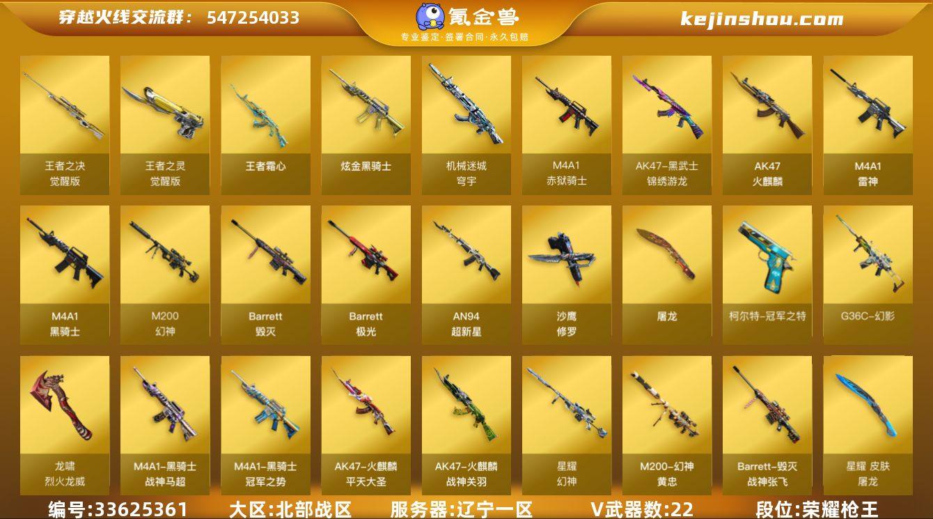 辽宁一区-24V-3王者武器数-1炫金武器数 【热门武器】:G36C-幻影,M200-幻神,柯尔特-冠军之特,M4A1-黑骑士,沙鹰-修罗*6,黄金猫猫手套-白鲨 【王者炫金武器】:王者霜心,炫金骑士 【音效卡】:M4A1-黑骑士音效卡,Barrett-毁灭音效卡,Barrett-极光音效卡,70KG语音包 【皮肤】:M200-幻神-黄忠皮肤,幻神-星耀 皮肤,雷神-源计划2.0专属 皮肤,火麒麟-战神关羽,火麒麟-平天大圣,毁灭-战神张飞,黑骑士-冠军之势,黑骑士-战神马超,屠龙-星耀 皮肤,轻型军用手斧-再燃火线 【角色】:星际战将,王者葵-惊若翩鸿,王者-迷迭香,奇洋探员,乔伊教练,修道士,云海玲珑,芳心审判者,风暴女,灵狐者-X,麻雀,潘多拉-X,青霞仙子,新娜塔莎,影武者-X,职业选手 【人偶武器】:M4A1-雷神-精英刀锋,迷你深渊冰龙,迷你牛魔王,迷你牛牛*3,迷你生化手雷,生化手雷-机甲核心*2,迷你艾比 【暴走生化】:超级对讲机 【挑战大师】:AK47-冰龙粉碎者 【英雄级武器】:AK47-火麒麟*2,M4A1-雷神,M4A1-黑骑士,AN94-超新星,QBZ03-天罚,黑武士-锦绣游龙,G36C-幻影,机械迷城-穹宇,Barrett-毁灭,Barrett-极光,M200-幻神,王者之决-觉醒版,沙鹰-修罗*6,柯尔特-冠军之特,王...