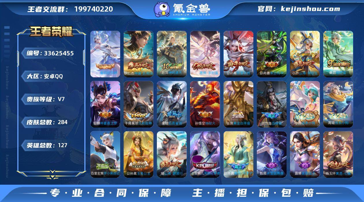 安卓Q-V7-至尊星耀V段位-127英雄-284皮肤-1典藏皮肤-12传说-69史诗 【英雄全皮】:孙权全皮 【荣耀典藏】:伽罗最初的交响 【传说皮肤】:狄仁杰神骥赴朔漠,后羿神树通天,虞姬愿照岁时盈,桑启鸣野蒿,小乔山海琳琅生,公孙离祈雪灵祝,张良黄金白羊座,干将莫邪久胜战神,虞姬云霓雀翎,貂蝉仲夏夜之梦,孙尚香末日机甲,孙悟空地狱火 【限定皮肤】:姜子牙天穹之誓,狄仁杰阴阳师,小乔山海琳琅生,赵云皇家上将,嬴政白昼王子,孙尚香蔷薇恋人,鲁班七号乒乒小将,庄周高山流水,高渐离死亡摇滚,孙膑寅虎展翼,芈月重明,芈月幻夜卜梦,吕布猎兽之王,甄姬游园惊梦,曹操烛龙,典韦穷奇,狄仁杰魔术师,狄仁杰万华元夜,达摩星际陆战队,达摩沙漠行僧,项羽海滩派对,老夫子醍醐杖,程咬金演武夺筹,兰陵王金庭之子,牛魔御旌,后羿圣弓游侠,李元芳银河之约,李元芳云中旅人,虞姬霸王别姬,钟馗驱傩正仪,杨玉环遇见飞天,杨玉环寅虎心曲,干将莫邪胡桃夹子,干将莫邪真爱魔法,雅典娜单词大作战,雅典娜黎明之约,鬼谷子原初探秘者,鬼谷子五谷丰年,黄忠火炮绅士,苏烈千军破阵,弈星混沌棋,公孙离祈雪灵祝,公孙离玉兔公主,沈梦溪星空之诺,沈梦溪大漠名商,明世...