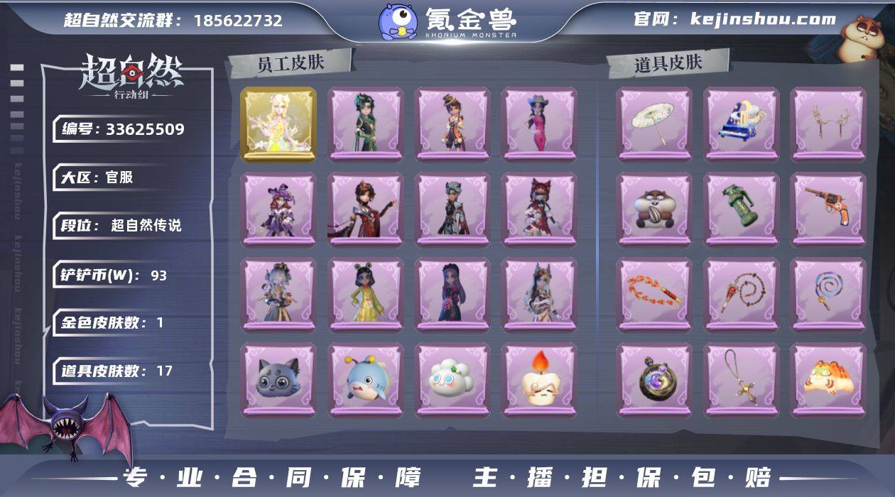 金色皮肤数量: 1 紫色皮肤数量: 11 道具皮肤数量: 17 段位: 超自然传说 员工: 逍遥,薇薇安,巫铃儿,莉莉,阿念,艾伦,小黄,零,爱丽丝,爱德华,兰,小满,临云 外观: 丝缕哀歌,白光莹,嘻嘻头套,烈焰红唇头套,呆滞头套,炙热烧烤,卑微头套,哈士奇头套,滑稽头套,鱼头怪头套,面具马头套,萨卡班甲鱼头套,小狗蛇点点头套,天使的呼唤,呱呱雨衣,除妖小师妹,火爆了头套,惊魂南瓜,莓果陷阱,樱桃奶油布丁,仙锋小姐,千夜星谕,雪墩墩头套,太空鲨头套,子夜证词,黎明猎手,耀眼的你,庆宴绮愿,烛光纪念,不朽的今夜,牛啤背包,磨砺成锋,饺饺者头套,夜浮船,孤独对望,春之声,侧耳倾听,园丁鲨鲨头套,煤球喵,放青松,春信香囊