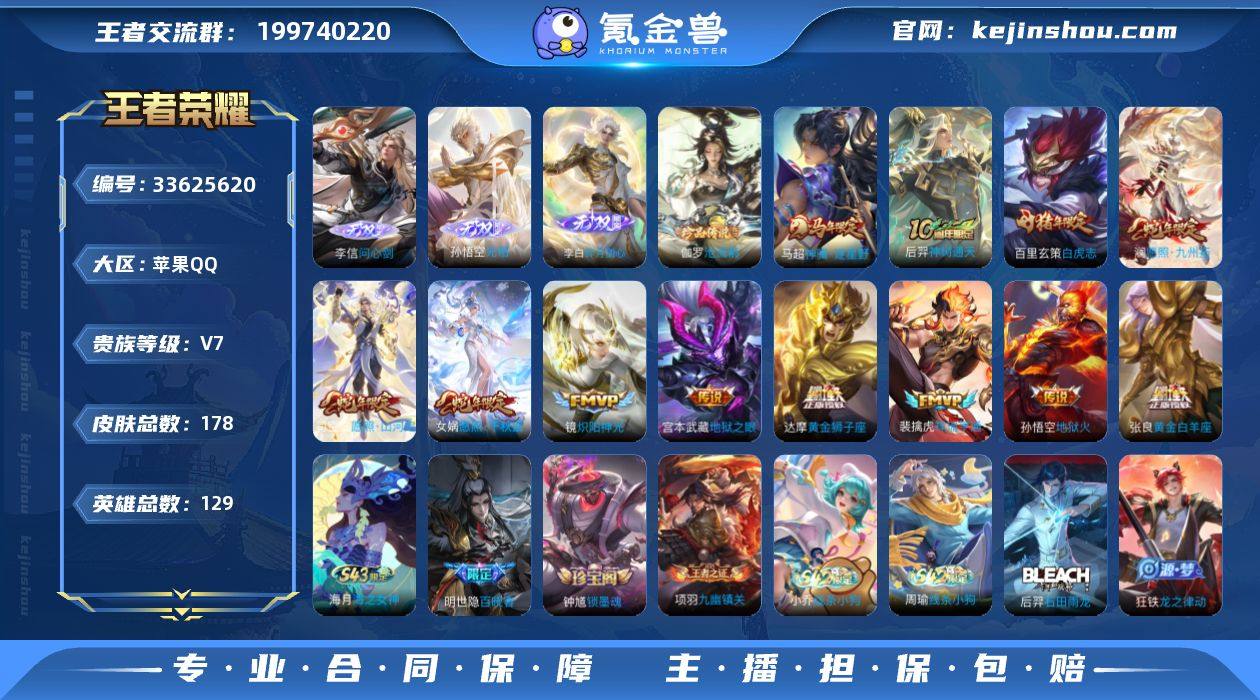 苹果Q-V7-最强王者段位-129英雄-178皮肤-3无双-1珍品传说-12传说-37史诗 【英雄全皮】:孙权全皮,苍全皮,敖隐全皮,影全皮 【无双皮肤】:李信问心剑,孙悟空无相,李白碎月剑心 【珍品传说】:伽罗沧流箭 【传说皮肤】:马超神骥逐星野,后羿神树通天,司空震愿照山河定,女娲愿照千秋盛,澜愿照九州拓,裴擒虎祥瑞亨通,镜炽阳神光,张良黄金白羊座,达摩黄金狮子座,百里玄策白虎志,宫本武藏地狱之眼,孙悟空地狱火 【限定皮肤】:狄仁杰阴阳师,赵云皇家上将,高渐离玩趣恶龙,夏侯惇朔风刀,曹操烛龙,典韦穷奇,狄仁杰魔术师,狄仁杰万华元夜,项羽海滩派对,老夫子醍醐杖,程咬金演武夺筹,孙悟空至尊宝,牛魔御旌,雅典娜单词大作战,太乙真人饕餮,鬼谷子原初探秘者,百里玄策白虎志,百里玄策原初追逐者,弈星混沌棋,明世隐疑决卦,裴擒虎李小龙,裴擒虎擒涛扼浪,狂铁御狮,米莱狄御霄,盾山御銮,上官婉儿梁祝,蒙犽狂想玩偶喵,鲁班大师探海日志,桑启海盐诗旅,阿古朵江河有灵,张良古海寻踪,鬼谷子天穹祈灯,李白碎月剑心 【年限皮肤】:百里玄策白虎志,司空震愿照山河定,女娲愿照千秋盛,澜愿照九州拓 【赛季限定】:太乙真人饕餮,曹操烛龙,典韦穷奇...