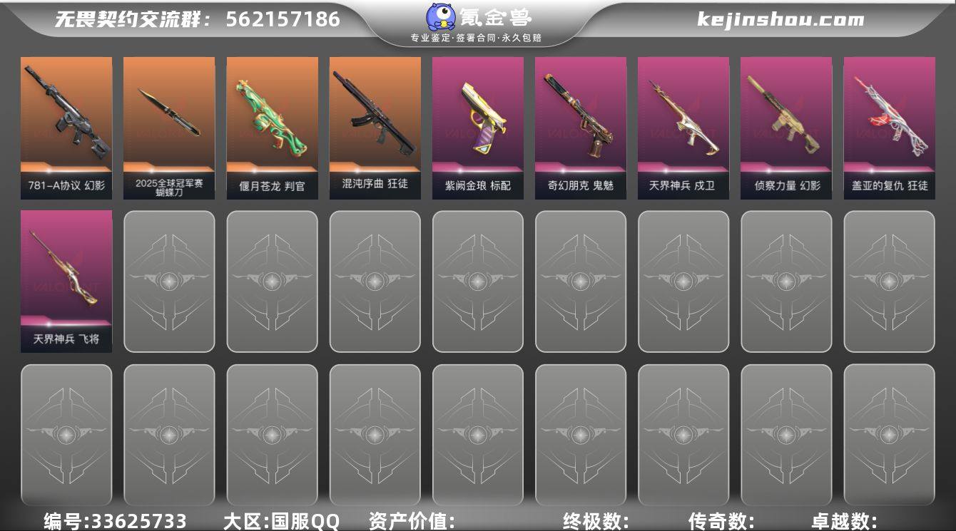 【套装】:2025全球冠军赛套装,ORA x 颗秒套装 【英雄】:炼狱,暮蝶,铁臂,捷风,雷兹,幽影,不死鸟,贤者,猎枭,零,芮娜,奇乐,尚勃勒,霓虹,斯凯,夜露,K/O,盖可,黑梦 【近战武器】:近战武器-2025全球冠军赛 蝴蝶刀,近战武器-碎心裂刃,近战武器-ORA x 颗秒 军刀,近战武器-阿特拉斯指挥部 甩棍,近战武器-星际猎兵 短剑 【狂徒】:狂徒-2025全球冠军赛,狂徒-混沌序曲,狂徒-滋滋X特攻队,狂徒-ORA x 颗秒,狂徒-盖亚的复仇 【幻影】:幻影-ORA x 颗秒,幻影-781-A协议,幻影-侦察力量,幻影-掠影//2.0 【戍卫】:戍卫-天界神兵 【冥驹】:冥驹-ORA x 颗秒 【飞将】:飞将-天界神兵 【判官】:判官-偃月苍龙 【标配】:标配-紫阙金琅 【正义】:正义-ORA x 颗秒 【鬼魅】:鬼魅-奇幻朋克 【卡面】:《双城之战》金克丝 卡面,代号红色 卡面,新兵报到 卡面,V契约 卡面,无畏契约 卡面 【喷漆】:霓光四射 喷漆,无畏契约GO!第一卷:贤者 喷漆,放下武器 喷漆,胜利属于无畏契约 喷漆,GLHF 喷漆,无畏契约 喷漆 【挂饰】:V25第六幕:神话 挂饰,无畏契约 纪念币 挂饰