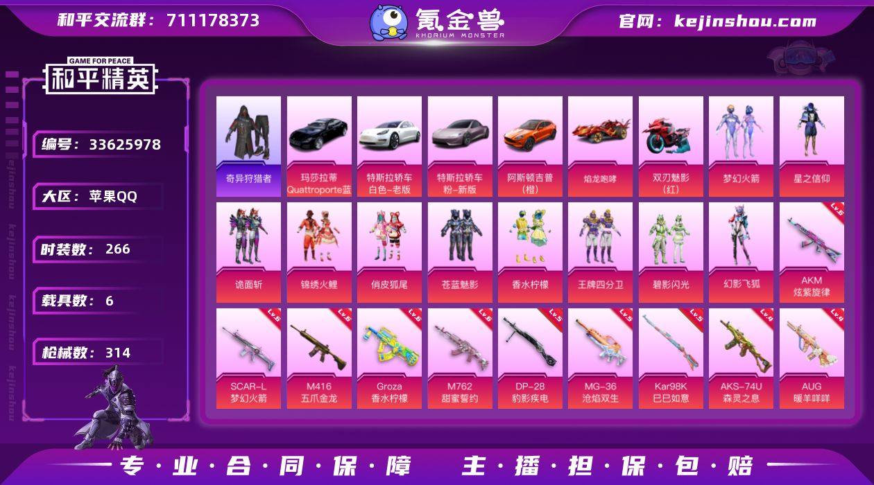 266套装/枪械16/装备424/载具6/战备232/王牌印记27/热力值119859/六级AKM-炫紫旋律/六级SCAR-L-梦幻火箭/六级M416-五爪金龙/六级GROZA-香水柠檬/四级AUG-暖羊咩咩/六级M762-甜蜜誓约/三级ACE32-萌骑漫游/四级AKS-74U-森灵之息/五级Kar98K-巳巳如意/一级M24-星之信仰/四级SKS-诡面斩/四级Mini14-荧光虫舞/三级MK14-福马献瑞/五级DP-28-豹影疾电/四级MG3-洛神天依/五级MG-36-沧焰双生/梦幻火箭(新101)/奇异狩猎者/套装-SS1特训/龟仙人/浪漫波比/粉红小猪/萌熊伴侣/星之信仰/诡面斩/锦绣火鲤/俏皮狐尾/苍蓝魅影/香水柠檬/王牌四分卫/碧影闪光/幻影飞狐/特斯拉Model 3(珍珠白)/特斯拉Roadster(沁心粉)/阿斯顿·马丁DBX(橙)/玛莎拉蒂Quattroporte(夜幕蓝)/焰龙咆哮/双人摩托-双刃魅影(红)/AKM炫紫旋律/SCAR-L梦幻火箭/M416五爪金龙/Groza香水柠檬/AUG-暖羊咩咩/M762甜蜜誓约/ACE32-萌骑漫游/AKS-74U-森灵之息/Kar98K-巳巳如意/M24星之信仰/SKS诡面斩/Mini14荧光虫舞/MK14-福马献瑞/DP-28-豹影疾电/MG3洛神天依/MG-36-沧焰双生/炫彩糖果飞行器/梦幻火箭飞行器/飞行器-诡面斩/飞行器-荧光虫舞/飞行器-阿狸红/飞行器-终极赛罗/极意拳锋飞行器/深海曼妙降落伞/绝对恒星降落伞/粉色回忆降...