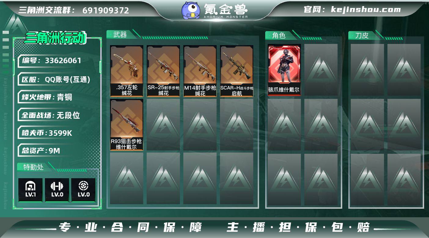 【sjs9860】可二次 玩够能回血 一红皮 烽火地带段位: 青铜 全面战场段位: 无段位 总资产: 9000000 哈夫币: 3599000 sjs9860 干员外观: 骇爪-维什戴尔 传说武器皮肤: R93狙击步枪-维什戴尔,SCAR-H战斗步枪-启航,.357左轮-缄花,SR-25射手步枪-缄花,M14射手步枪-缄花 载具皮肤: 轮式突击炮-荣耀 亮点: 【sjs9860】9m总资产-3599k哈夫币-10烽火等级-青铜-1战场等级-无军衔【近战皮肤】:近战-黑鹰【干员外观】:骇爪-维什戴尔【传说外观】:SCAR-H战斗步枪-启航,M14射手步枪-缄花,SR-25射手步枪-缄花,R93狙击步枪-维什戴尔,.357左轮-缄花【稀有外观】:M7战斗步枪-捣蛋鬼,AK-12突击步枪-零点【普通外观】:QCQ171冲锋枪-三角洲力量【载具外观】:轮式突击炮-荣耀【挂饰】:挂饰-维什戴尔,挂饰-蚀金玫瑰,挂饰-诡影喷火兵*2,挂饰-启程,挂饰-缄花,挂饰-紧急会议*8