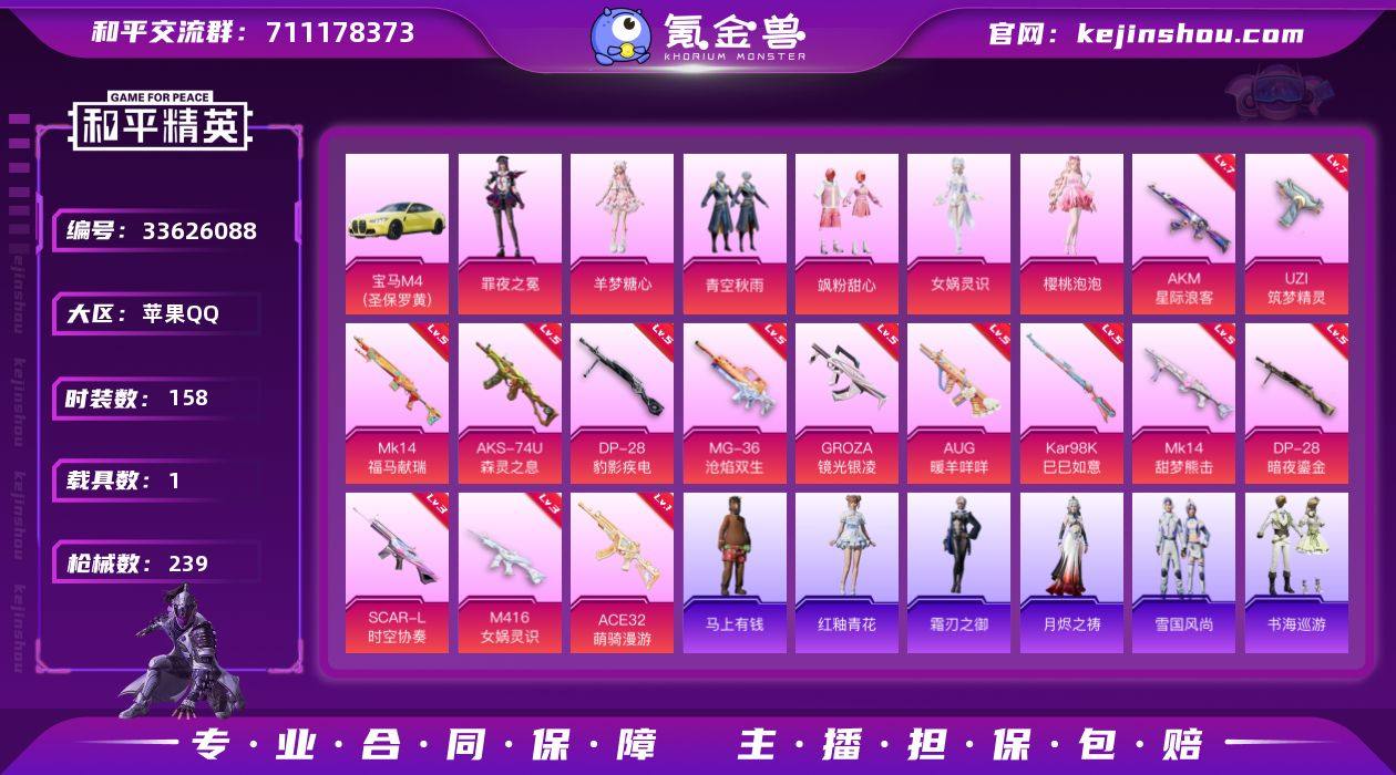 【kyhp1882】苹果 手Q-6粉装-14特效枪-1载具-5粉色飞行器-73898热力值-8王牌印记-158套装-239枪皮 【热门品类】:套装-浪漫天命,套装-龟仙人,套装-暗影哥特,套装-浪漫波比,套装-粉红小猪 【粉色套装】:粉装-青空秋雨,粉装-飒粉甜心,角色-女娲灵识,角色-樱桃泡泡,角色-羊梦糖心,角色-罪夜之冕 【粉色枪皮等级】:AKM-星际浪客(七级),SCAR-L-时空协奏(三级),M416-女娲灵识(三级),GROZA-镜光银凌(五级),AUG-暖羊咩咩(五级),ACE32-萌骑漫游(一级),UZI-筑梦精灵(七级),AKS-74U-森灵之息(五级),Kar98K-巳巳如意(五级),Mk14-甜梦熊击(五级),Mk14-福马献瑞(五级),DP-28-暗夜鎏金(五级),DP-28-豹影疾电(五级),MG-36-沧焰双生(五级) 【粉色载具】:宝马M4(圣保罗黄) 【粉色枪皮】:AKM-星际浪客,SCAR-L-时空协奏,M416-女娲灵识,GROZA-镜光银凌,AUG-暖羊咩咩,ACE32-萌骑漫游,UZI-筑梦精灵,AKS-74U-森灵之息,Kar98K-巳巳如意,Mk14-甜梦熊击,Mk14-福马献瑞,DP-28-暗夜鎏金,DP-28-豹影疾电,MG-36-沧焰双生 【粉色飞行器】:炫彩糖果飞行器,天之羽翼飞行器,庄周梦蝶飞行器,太空嘟嘟飞行器,飞天猪飞行器 【粉色降落伞】:绝对恒星降落伞,幻影战神...