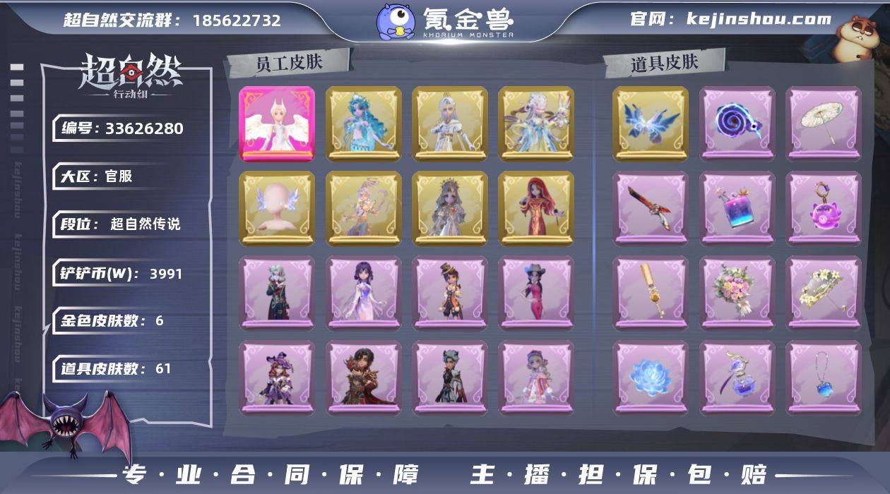 ZRX1017,红皮:1,粉皮:6,金皮:17,紫皮:61,道具皮:61,外观:小黄-炽天使,巫铃儿-镜花辞,莉莉-瑶台梦,薇薇安-海月息潮,逍遥-莲华渡,薇薇安-圣光之谕,逍遥-剑仙,莉莉-情公主,阿念-王子与骑士,兰-千夜星谕,阿念-庆宴绮愿,莉莉-莓果陷阱,小黄-异色序曲,逍遥-绣春逍影,爱丽丝-耀眼的你,艾伦-黎明猎手,巫铃儿-素影瑶光,小黄-呱呱雨衣,爱德华-梵卓之礼,巫铃儿-琢玉怀乡,零-搬开山,爱丽丝-丝缕哀歌,阿念-迷途僵宝,爱丽丝-甜梦派对,道具:喷气背包-晶澜灵翼,桃木剑-寂潮之刃,刺刀-紫气东来,黄牛能量饮料-青玉抱丹,电击枪-权杖的许诺,转轮手枪-新星时代,摸金符-紫霄,腰包-宝剑八,铲子-撒拉弗的祷告,铲子-赞萌波板糖,黄牛能量饮料-星空特调,长鞭-缚誓之锁,腰包-惊魂娃娃,急救包-土拨鼠捏捏,长枪-波塞冬,急救包-蔷薇物语,刺刀-铂刺与红萼,伞-郁金春信,额外的背包-飞花令,闪光弹-金戈玄铜,夜视仪-敛花容,专业手电-星寂,刺刀-碧络琅环,腰包-红运福虎,摸金符-海洋之心,腰包-私藏的银河,喷气背包-乘风溯雪,铲子-圣心之泪,荧光棒-花火-荧光棒-花火,除颤仪-冰晶般的代价,音响-happy猫,葫芦-伏妖塔,传送按钮-昆仑镜,折扇-赴此良宵,闪光弹-邪恶滚滚猫,桃木剑-凤鸣九天,除颤仪-弦外之音,长枪-罪棘,音响-...