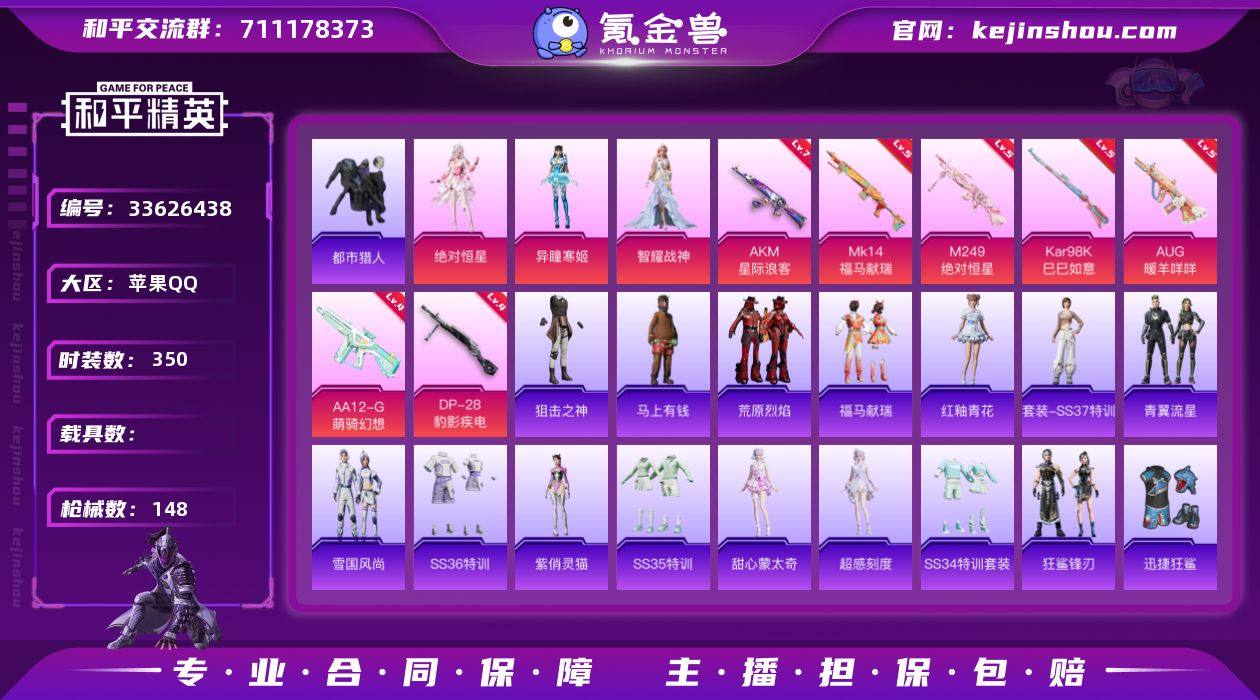 实名: 可修改 时装数: 350 枪械数: 148 战备数: 89 热门装扮: 迅捷狂鲨,鹰眼刺客,都市猎人,智耀战神,异瞳寒姬,绝对恒星 稀有枪皮: AKM星际浪客,Kar98K-巳巳如意,AUG-暖羊咩咩,DP-28-豹影疾电,M249-绝对恒星,AA12-G-萌骑幻想