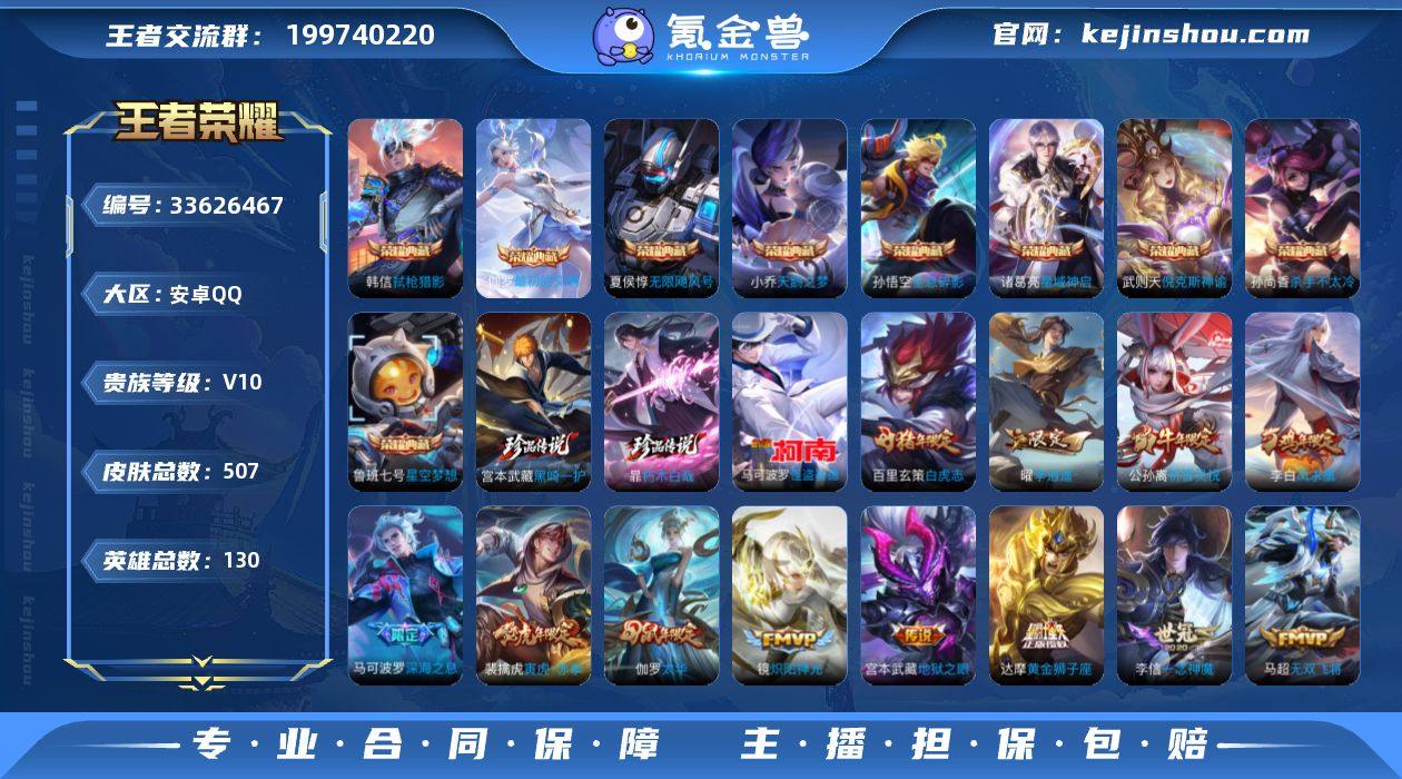 【王者荣耀】珍品无双0 典藏10 无双0 珍品传说3 传说58 史诗179 英雄130 皮肤507 贵族10级 荣耀典藏:无限飓风号|全息碎影|天鹅之梦|杀手不太冷|武则天|倪克斯神谕|弑枪猎影|星空梦想|星域神启|最初的交响__珍品传说:怪盗基德|朽木白哉|黑崎一护__传说皮肤:鸣野蒿|枫霜尽|前尘镜|深海之息|无尽星芒|无双飞将|挚爱花嫁|挚爱之约|启示之音|花朝如约|补天|孙尚香-异界灵契|绛天战甲|炽阳神光|启明星使|胖达荣荣|地狱之眼|地狱火|海洋之心|孙策-末日机甲|仲夏夜之梦|云霓雀翎|久胜战神|黄金狮子座|狄仁杰-超时空战士|黄金射手座|黄金白羊座|猫影幻舞|刘备-时之恋人|一念神魔|云鹰飞将|冠军飞将|飞鸢探春|李逍遥|游龙清影|乞巧织情|淬星耀世|瑶-时之祈愿|电玩·雷克斯|鹤羽星尊|孙尚香-末日机甲|白虎志|凤求凰|兰陵王-默契交锋|零号·赤焰|祈雪灵祝|时雨天司|太华|武陵仙君|武圣|小乔-音你心动|寅虎·瑞焰|遇见胡旋|周瑜-音你心动|逐花归海|觅芳踪|寅虎·赤拳|灼幽烈阳__稀有限定:寅虎·御盾|寅虎·展翼|寅虎·心曲|奔雷神使|御风骁将|白晶晶|梅西|瑞麟志|青龙志|玄武志|朱雀志|虞姬-霸王别姬|大圣娶亲|一生所爱|引擎之心|纯白花嫁|岱宗|玄嵩|幽恒|飞衡|奇迹圣诞|蜜橘之夏|神威|青春决赛季|...