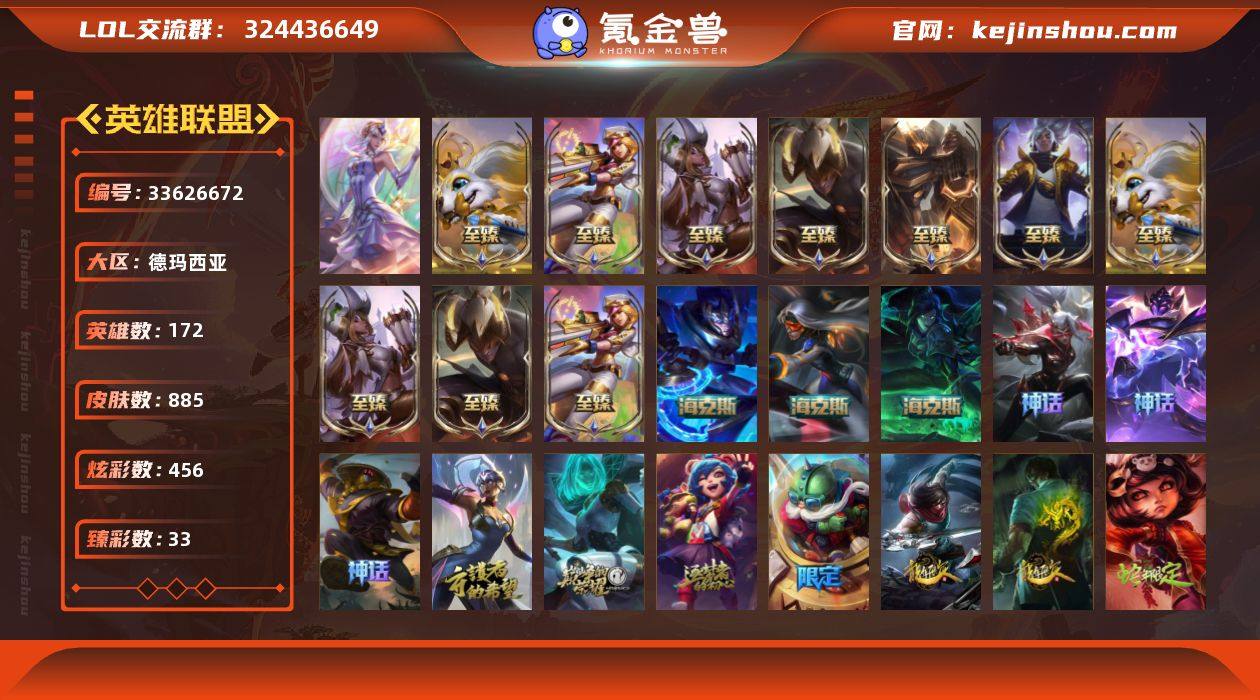 青铜段位-172英雄-885皮肤-456炫彩-1终极-20神话-199限定-69传说-208史诗 【珍稀头像】:雪花头像 【热门头像】:爱意绵绵头像,觅心之翼奎因头像,觅心游侠卢锡安头像 【神话皮肤】:十周年纪念安妮,源代码乐芙兰,新卧虎藏龙贾克斯,黎明使者卡尔玛,殿堂传奇薇恩,水晶巫灵泽拉斯 【至臻皮肤】:至臻魅惑女巫厄运小姐,至臻魅惑女巫厄运小姐(2022),至臻电玩女神凯特琳,至臻电玩女神凯特琳(2022),至臻黑夜使者李青,至臻黑夜使者李青(2022),至臻王国机神玄武盖伦,至臻绒毛菲兹,至臻绒毛菲兹(2022),至臻真实伤害亚索,至臻灵魂莲华劫 【海克斯皮肤】:新创战纪希维尔,海克斯科技嘉文四世,摄魂使者薇恩 【臻彩皮肤】:龙的传人李青飞龙在天,剪纸仙灵嘉文四世日进斗金,天龙之子卡莎飞龙乘云,无畏骑士瑟庄妮赤子初心,冠军之箭艾希凯旋圣装,吕布奉先炫金战神,赵云子龙炫金将军,墨之影武者亚索金墨耀影,冠军之志瑞兹凯旋圣装,冠军掠夺者卡兹克凯旋圣装,冠军之刃锐雯2016凯旋圣装,冠军典狱长锤石凯旋圣装,冠军之血希瓦娜凯旋圣装,冠军之矛卡莉丝塔凯旋圣装,冠军之隐劫凯旋圣装,雾雨之刃锐雯,星之守护者娑娜未来之光,弹幕天使卡莎炽天使公正,星之守护者...
