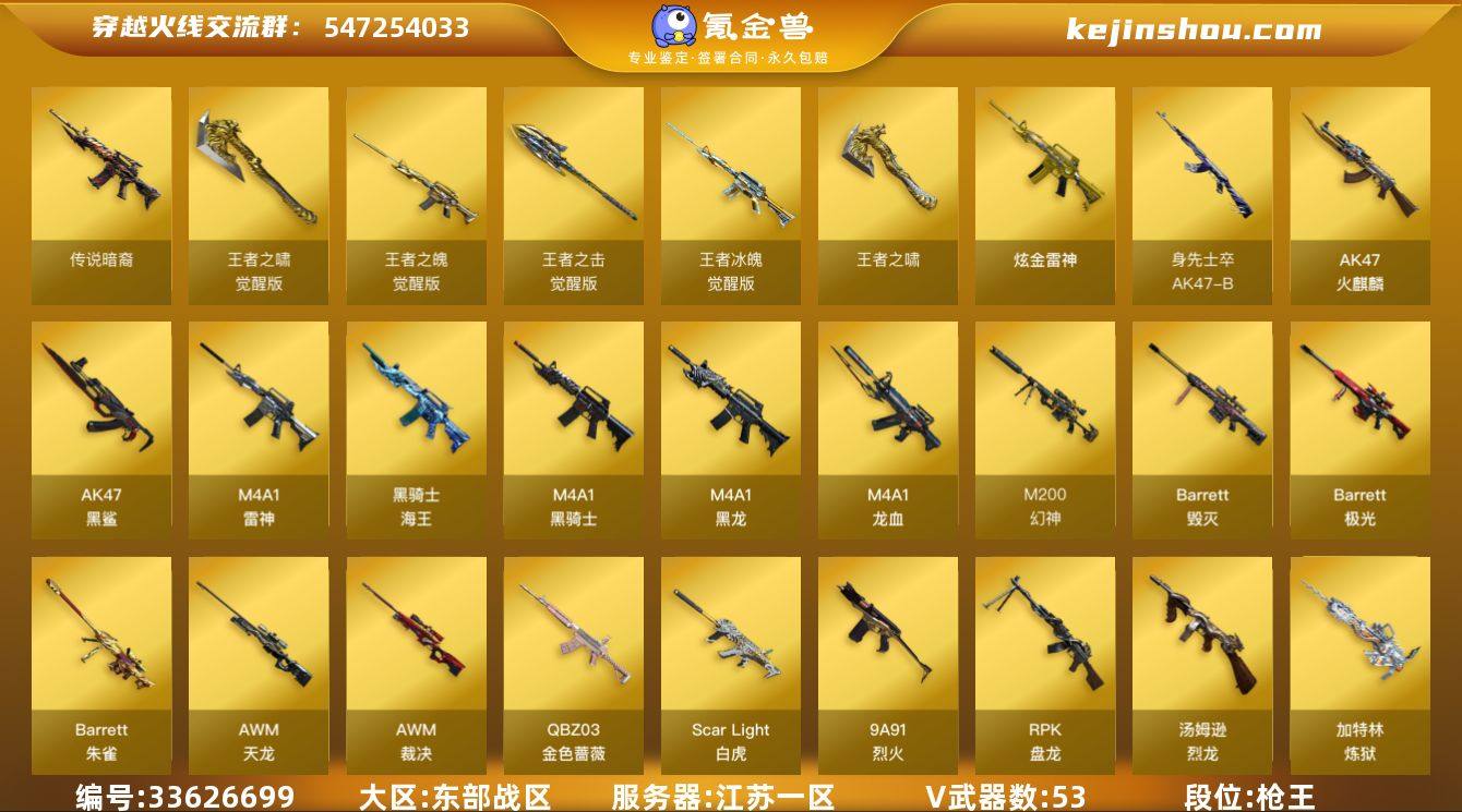 【ky7012】江苏一区-60V-13王者武器数-1炫金武器数 【传说武器】:传说暗裔 【热门武器】:传说暗裔,QBZ03-金色蔷薇,Scar Light-白虎,M200-幻神,荣耀世冠-火麒麟,荣耀世冠-雷神,荣耀世冠-柯尔特,M4A1-黑骑士*2,汤姆逊-烈龙*5,RPK-盘龙,加特林-炼狱,羊驼玩偶,沙鹰-修罗*4 【王者炫金武器】:王者之啸,王者之魄高爆手雷*4,王者之魄闪光弹,王者之魄烟雾弹,炫金雷神 【音效卡】:AK47-火麒麟音效卡,M4A1-黑骑士音效卡,Barrett-毁灭音效卡 【皮肤】:幻神-冠军之幻,雷神-星空,雷神-虎将,雷神-宠儿-2019MVP,火麒麟-雷神,火麒麟-华夏之心,火麒麟-平天大圣,毁灭-冠军之怒,黑骑士-地狱火,战神-粉色甜心皮肤*2,战神-紫绶金章皮肤*3,战神-流金岁月皮肤,AK47-B-常胜将军-曹操*2,AK47-B-常胜将军-刘备,AK47-B-常胜将军-孙权,极光-能量核心,修罗-冠军之魂 【角色】:樱,王者-零-国色天香,王者-葵-貂蝉,王者-魅影,王者-迷迭香,风暴女,灵狐者-黄金海岸,潘多拉-X,兔囡囡,王者-零-传说之路,新灵狐者,新娜塔莎,职业选手 【人偶武器】:迷你牛牛,闪光弹-小乔,闪光弹-貂蝉,高爆手雷-大乔 【暴走生化】:异变清道夫,黑龙吞噬者 【挑战大师】:AK4...