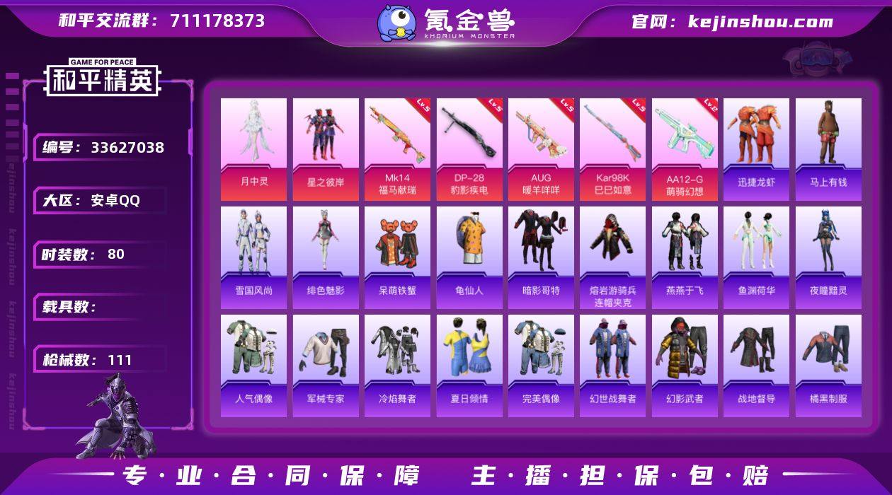 YZJ17058-不可二次-安卓Q-2粉装5特效枪5热门80套装111枪皮 26693热力值 极品小号 地铁满天赋 月中灵 星之彼岸 权威小菠萝 夏日倾情 红眼罩 NV战队服 满级AUG暖羊 历史荣耀皇冠Ⅴ 【2粉装】 月中灵 星之彼岸 【5特效枪】 Kar98K-巳巳如意 (5级) DP-28-豹影疾电 (5级) AUG-暖羊咩咩 (5级) Mk14-福马献瑞 (5级) AA12-G-萌骑幻想 (2级) 【5热门】 龟仙人 呆萌铁蟹 NV战队服 暗影哥特 破蛋小黄鸡 【1头盔】 幻影战神头盔 【1背包】 幻影战神背包 营地ID:1020962552