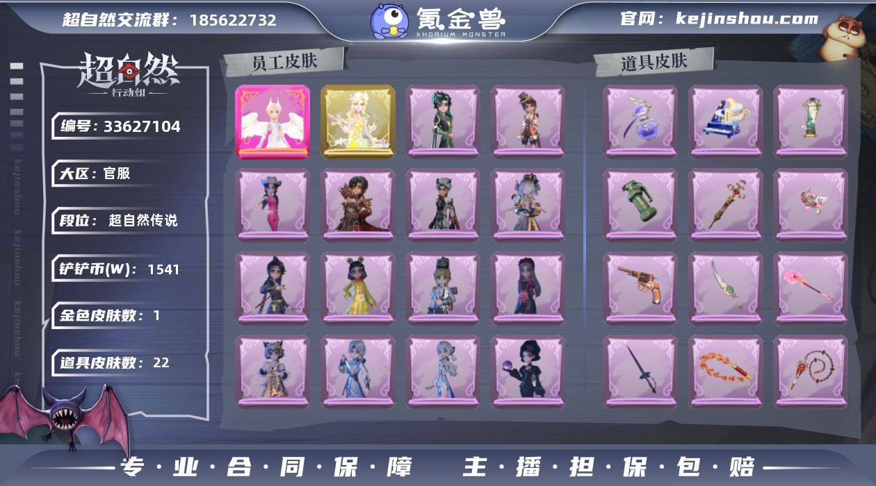 ZRX1023,粉皮:1,金皮:1,紫皮:14,道具皮:22,外观:小黄-炽天使,兰-春之声,爱丽丝-丝缕哀歌,零-磨砺成锋,艾伦-黎明猎手,小黄-呱呱雨衣,逍遥-绣春逍影,零-青云逸歌,阿念-庆宴绮愿,爱丽丝-耀眼的你,零-搬开山,薇薇安-黑月挽歌,巫铃儿-素影瑶光,阿念-王子与骑士,小黄-霓裳踏雪,莉莉-除妖小师妹,道具:铲子-赞萌波板糖,长鞭-缚誓之锁,传送按钮-浮生一梦,转轮手枪-新星时代,音响-月光奏鸣曲,专业手电-花束般的告白,急救包-蔷薇物语,音响-happy猫,音响-鸣沙鼓,电击枪-甜蜜泡泡枪,刺刀-碧络琅环,摸金符-祝祷词,额外的背包-飞花令,传送按钮-幻宠之门,急救包-末章心跳,闪光弹-金戈玄铜,腰包-红运福虎,桃木剑-永眠曲,黄牛能量饮料-无人岸,短管猎枪-星光的裁决,长鞭-新春炸响,腰包-宝剑八,饰品:头饰-大葱明头套,头饰-火爆了头套,头饰-太空鲨头套,头饰-咬咬鲨头套,头饰-蒜了八,头饰-面具马头套,头饰-炙热烧烤,头饰-嘻嘻头套,头饰-芝麻糊汤圆,头饰-鱼头怪头套,头饰-饺饺者头套,头饰-烛光纪念,头饰-萨卡班甲鱼头套,头饰-驼半仙头套,头饰-滑稽头套,头饰-烈焰红唇头套,头饰-马上有钱,头饰-卑微头套,头饰-哈士奇头套,头饰-呆滞头套,头饰-像素朋克墨镜,头饰-后室幸存者头套,挂饰-未竟乐园,挂饰-钗头...