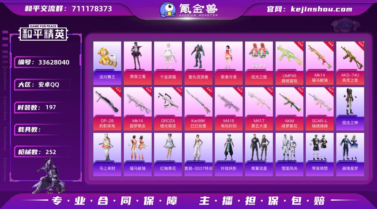 可二次实名【连体号金鞋11特效枪5粉装 送王者1珍品182皮肤6传说1星元 秒换绑不用等】 安卓Q区-77009热力值-197套装-252枪皮 【1稀有】 派对舞王(金靴子)【5粉装】 复仇流浪者 罪夜之冕 炫光之旅 歌者泠鸢 角色-千金淑猫【11特效枪】 AKS-74U-森灵之息(5级) Mk14-福马献瑞(5级) UMP45-萌骑冒险(2级) SCAR-L-锦绣绵绵(5级) M417-第五大道(7级) AKM-绿萝繁花(5级) Kar98K-巳巳如意(5级) Mk14-甜梦熊击(5级) M416-电玩时刻(5级) GROZA-镜光银凌(5级) DP-28-豹影疾电(5级)【248热门】 浪漫天命 雪山精英(老6服) 激萌罗小黑 小丑鱼 极速红龙 狂沙舞者 白色伏地魔 SS27特训 SS26特训 SS25特训 SS24特训 SS23特训 SS22特训 M24-歌者泠鸢 AKM-缤纷海域 AKM-环太平洋 SCAR-L-玉兔迎春 GROZA-田园牧歌 M762-天降萌叽 Mk47-乌木金纹 SKS-糯团青竹 UZI-娇憨猪猪 UMP45-蓝色火焰 S12K-垂柳戏鸭 DBS-彩虹符号 M249-彩虹符号 MG3-幻世战舞者 AKM-霓虹街区 AKM-星之彼岸 M416-蓝色火焰 GROZA-彩虹符号 破蛋小黄鸡 长空猛禽 迎春赐吉 夏日倾情 甜蜜熊情侣 特训学院 燃烧卡路里 青涩时光 青年教官 牛气冲天 霓虹街区 妙红点点 懵萌河马 魅力单车 猎鹰 黎明保卫者 蓝色运动 橘黑制服 竞技达人朋...