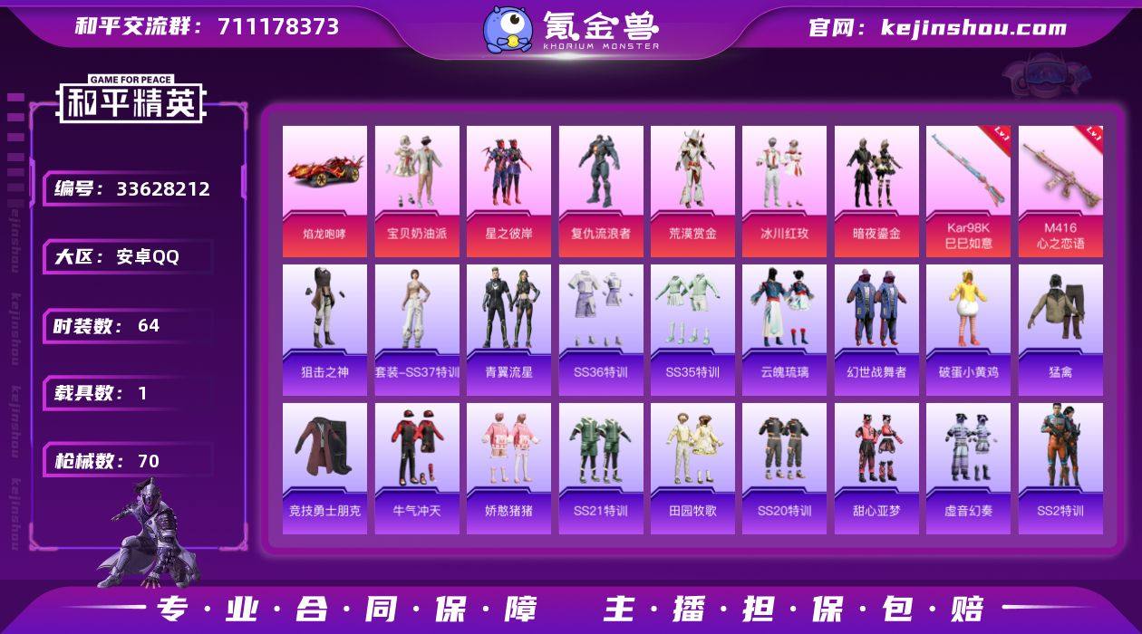 可二次实名【M4心之恋语猫包6粉装2特效枪1载具 秒换绑不用等】 安卓Q区-27094热力值-64套装-70枪皮 【1载具】 焰龙咆哮【2稀有】 百万伏待背包(猫包) AKM-百万伏特【6粉装】 宝贝奶油派 星之彼岸 冰川红玫 复仇流浪者 暗夜鎏金 荒漠赏金【2特效枪】 M416-心之恋语(5级) Kar98K-巳巳如意(4级)【53热门】 暗夜契约(假黑丝) 雪山精英(老6服) SS2特训 SS23特训 SS22特训 M762-乌木金纹 SCAR-L-玉兔迎春 GROZA-田园牧歌 M762-天降萌叽 Mk47-乌木金纹 UZI-娇憨猪猪 S12K-垂柳戏鸭 MG3-幻世战舞者 AKM-星之信仰 SCAR-L-甜蜜誓约 M416-蓝色火焰 M762-暗夜鎏金 破蛋小黄鸡 长空猛禽 虚音幻奏 甜心亚梦 牛气冲天 魅力单车 蓝色运动 竞技勇士朋克 黄色运动 黄色伏地魔 黑色伏地魔 和煦暖阳 P90-紫矿核心 GROZA-紫矿核心 MG-36-薄荷星砂 SS20特训 SS21特训 ACE32-冰晶雪宝 青翼流星 SS31特训 SS36特训 战术大师 狙击之神 M416-糯团青竹 撬棍-环太平洋 平底锅-光之冒险 MG3-乌木金纹 平底锅-甜心亚梦 平底锅-娇憨猪猪 SS35特训 平底锅-田园牧歌 P90-巳巳如意 S686-巳巳如意 云魄琉璃 SS37特训 元素星魂【1飞行器】 太空嘟嘟飞行器【11背包】 特殊使命背包(3级) 彩虹甜喵背包(3级) 甜心...