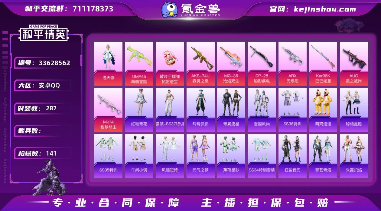 AL702593 【洛天依10个特效 极品特效小号优质套装:角色-洛天依,套装-龟仙人,角色-猎影月神 优质武器皮肤:AUG-星之彼岸,ARX-无垠阁,Kar98K-星穹咏叹调,Kar98K-巳巳如意,Mk14-福马献瑞,Mk14-甜梦熊击,AKS-74U-森灵之息,UMP45-萌骑冒险,MG-36-沧焰双生,DP-28-豹影疾电,破片手榴弹-招财进宝 】 热力值36691 枪皮数量141 粉装数1 套装数量75 时装数287 战备数81 其他武器皮肤122 头盔51 动作27 伙伴3 其他武器皮肤:AUG-异域银装,AUG-紫晶流影,AUG-冰晶雪宝,蜜獾-风迹短诗,蜜獾-启元战纹,蜜罐-精灵梦叶罗丽,蜜獾-绿洲时空,蜜獾-天降萌叽,蜜獾-乌木金纹,ARX-凌霄紫焰,AC-VAL-六号稻草人,AC-VAL-乌木金纹,GROZA-福马献瑞,GROZA-紫矿核心,GROZA-恐龙拽拽,GROZA-海盐豹豹,SCAR-L-星途旅人,SCAR-L-夜灯,SCAR-L-彩虹符号,SCAR-L-海盐豹豹,AKM-霓彩脉冲,AKM-涂鸦街区,AKM-破晓战魂,AKM-星之彼岸,AKM-龙的传人,Famas-乌木金纹,Famas-霓彩脉冲,Mk47-风迹短诗,M416-魔童闹海敖闰,M762-甜心宝贝,M762-云朵鹅,ACE32-冰晶雪宝,M16A4-雨过天青,Kar98K-星穹咏叹调,AMR-喜羊羊与灰太狼,AMR-雨过天青,AMR-鸡智如我,AMR-乌木金纹,SVD-云朵鹅,SV...