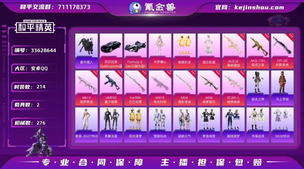 【都市男神10特效枪3粉装2载具 秒换绑不用等】 安卓Q区-81957热力值-214套装-276枪皮 【2载具】 玛莎拉蒂Q蓝色 Formula E Gen2(幽光蓝)【3稀有】 都市猎人 冷酷挑战者 奇异狩猎者【3粉装】 傲傲奶龙 角色-烟云彩露 角色-羊梦糖心【10特效枪】 AKS-74U-森灵之息(5级) ACE32-萌骑漫游(5级) M24-莲影清波(7级) SCAR-L-锦绣绵绵(5级) AKM-绿萝繁花(5级) Kar98K-巳巳如意(5级) Mk14-甜梦熊击(5级) M416-电玩时刻(5级) DP-28-豹影疾电(5级) UMP45-量子极限(5级)【269热门】 浪漫天命 都市猎人(蓝口罩) 小丑鱼 金羽特工 极速红龙 团圆交子 瑞龙福将 白色伏地魔 SS27特训 SS26特训 SS25特训 SS24特训 SS23特训 SS22特训 Mk14-暗星紫秘 AKM-缤纷海域 AWM-飒粉甜心 SCAR-L-玉兔迎春 GROZA-田园牧歌 AUG-幻影战神 Mk47-乌木金纹 SKS-糯团青竹 UZI-娇憨猪猪 M416-夜灯 UMP45-蓝色火焰 DBS-彩虹符号 M249-彩虹符号 MG3-幻世战舞者 AKM-虎虎生威 AKM-霓虹街区 鹰眼刺客 M416-蓝色火焰 GROZA-彩虹符号 破蛋小黄鸡 长空猛禽 弄潮海豚 虚音幻奏 夏日倾情 甜心亚梦 甜蜜熊情侣 特训学院 燃烧卡路里 青涩时光 青年教官 牛气冲天 霓虹街区 魅力单车 六六大吉 猎鹰 黎明保卫者 蓝色运动 橘黑制服 竞...