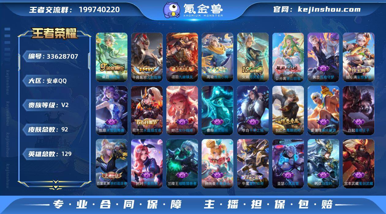 实名: 可修改 性别: 女号 贵族等级: V2 英雄数: 129 皮肤数: 92 传说皮: 久胜战神 限定皮: 鸣野蒿 亮点: 【优质装备】:久胜战神,涂山容容