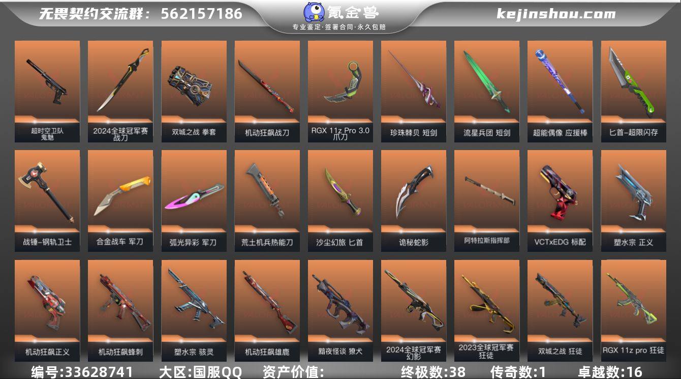 【套装】:离火刃套装,2024全球冠军赛套装,塑水宗套装,离火刃套装,《双城之战》收藏套装,机动狂飙套装,VCTxEDG 队伍套装,盖世英雄套装,无畏启程套装 【英雄】:幻棱,炼狱,维斯,暮蝶,钛狐,壹决,铁臂,捷风,雷兹,幽影,不死鸟,贤者,猎枭,蝰蛇,零,芮娜,奇乐,尚勃勒,霓虹,斯凯,夜露,星礈,K/O,海神,盖可,黑梦,钢锁 【近战武器】:近战武器-2024全球冠军赛 战刀,近战武器-剥皮小刀,近战武器-RGX 11z Pro//3.0 爪刀,近战武器-离火刃,近战武器-黑波之刃,近战武器-落英飞旋,近战武器-双城之战 拳套,近战武器-珍珠棘贝 短剑,近战武器-流星兵团 短剑,近战武器-超能偶像 应援棒,近战武器-超限闪存 匕首,近战武器-定海神珍,近战武器-钢轨卫士 战锤,近战武器-合金战车 军刀,近战武器-弧光异彩 军刀,近战武器-荒土机兵 热能刀,近战武器-机动狂飙 战刀,近战武器-沙尘幻旅 匕首,近战武器-诡秘蛇影 军刀,近战武器-阿特拉斯指挥部 甩棍 【狂徒】:狂徒-2023全球冠军赛,狂徒-归零者,狂徒-混沌序曲,狂徒-机动狂飙,狂徒-双城之战,狂徒-塑水宗,狂徒-RGX 11z Pro,狂徒-光荣异象,狂徒-堕天遗武,狂徒-盖世英雄,狂徒-盖亚的复仇,狂徒-耀鳞...