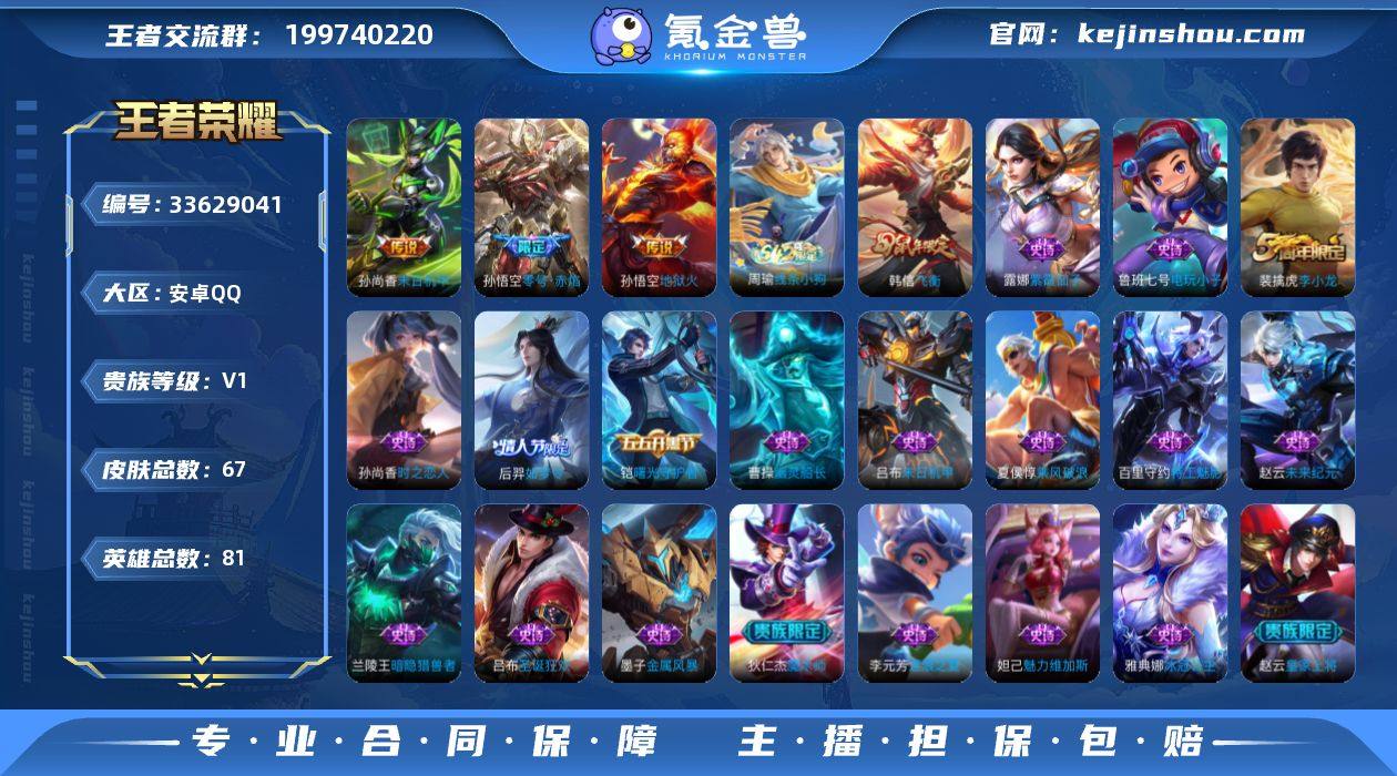 安卓Q-V0-荣耀黄金IV段位-81英雄-67皮肤-3传说-20史诗 【传说皮肤】:孙悟空零号赤焰,孙尚香末日机甲,孙悟空地狱火 【限定皮肤】:狄仁杰阴阳师,赵云皇家上将,夏侯惇朔风刀,狄仁杰魔术师,狄仁杰万华元夜,达摩星际陆战队,项羽海滩派对,老夫子醍醐杖,程咬金演武夺筹,韩信飞衡,孙悟空零号赤焰,后羿如梦令,钟馗驱傩正仪,雅典娜单词大作战,鬼谷子原初探秘者,弈星混沌棋,明世隐疑决卦,裴擒虎李小龙 【年限皮肤】:韩信飞衡 【赛季限定】:夏侯惇朔风刀,弈星混沌棋,明世隐疑决卦,老夫子醍醐杖,鬼谷子原初探秘者,狄仁杰万华元夜,程咬金演武夺筹,钟馗驱傩正仪 【战令限定】:雅典娜单词大作战,达摩星际陆战队,周瑜线条小狗 【史诗皮肤】:周瑜线条小狗,裴擒虎李小龙,孙尚香时之恋人,后羿如梦令,韩信飞衡,李元芳逐浪之夏,铠曙光守护者,百里守约特工魅影,雅典娜冰冠公主,兰陵王暗隐猎兽者,夏侯惇乘风破浪,吕布末日机甲,曹操幽灵船长,吕布圣诞狂欢,墨子金属风暴,妲己魅力维加斯,狄仁杰魔术师,赵云未来纪元,赵云皇家上将,露娜紫霞仙子,鲁班七号电玩小子 【其他皮肤】:鲁班大师乓乓大师,钟馗驱傩正仪,程咬金演武夺筹,达摩星际陆战队,...