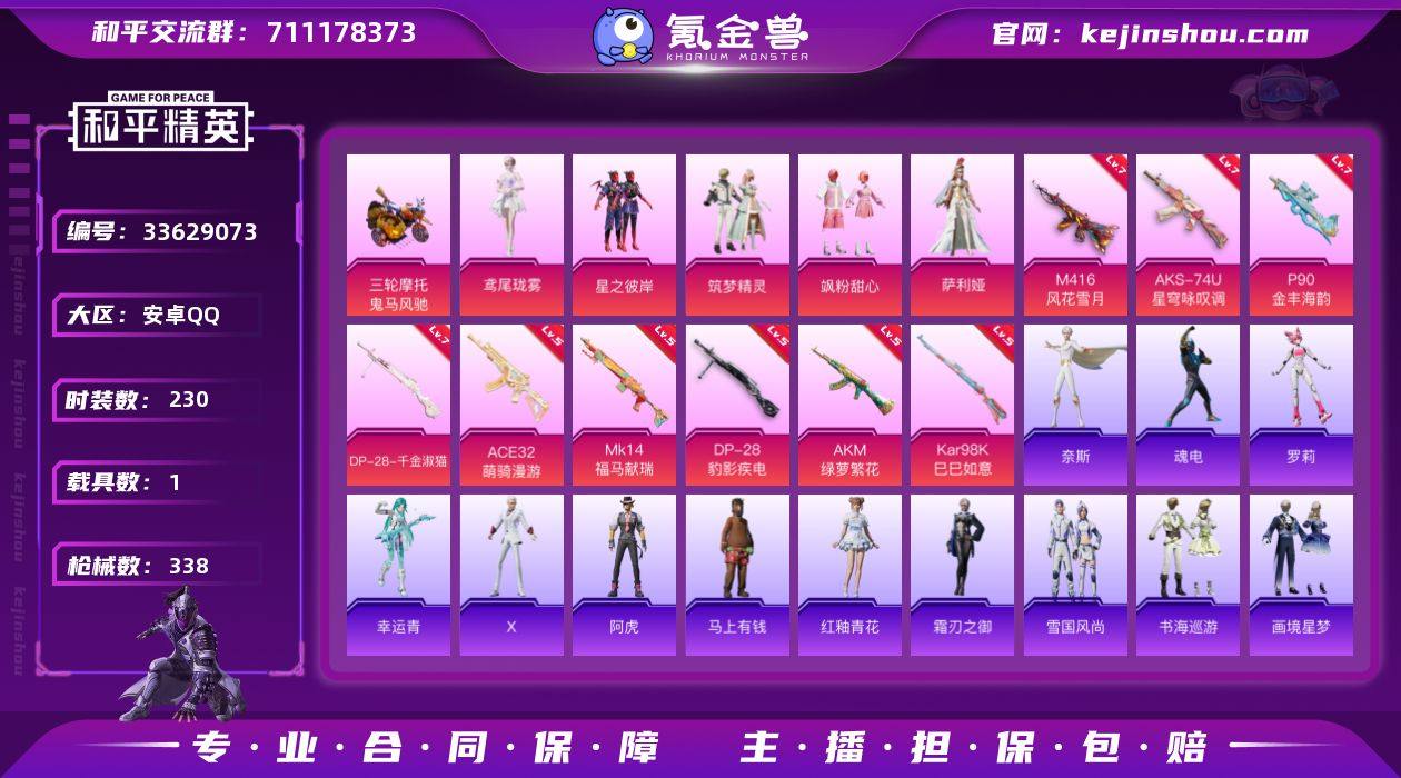 【kyhp1856】安卓 手Q-5粉装-9特效枪-1载具-6粉色飞行器-103098热力值-21王牌印记-230套装-338枪皮 【热门品类】:套装-龟仙人,套装-粉红小猪 【粉色套装】:粉装-星之彼岸,粉装-筑梦精灵,粉装-飒粉甜心,角色-萨利娅,角色-鸢尾珑雾 【粉色枪皮等级】:AKM-绿萝繁花(五级),M416-风花雪月(七级),ACE32-萌骑漫游(五级),AKS-74U-星穹咏叹调(七级),P90-金丰海韵(七级),Kar98K-巳巳如意(五级),Mk14-福马献瑞(五级),DP-28-千金淑猫(七级),DP-28-豹影疾电(五级) 【粉色载具】:鬼马风驰 【粉色枪皮】:AKM-绿萝繁花,M416-风花雪月,ACE32-萌骑漫游,AKS-74U-星穹咏叹调,P90-金丰海韵,Kar98K-巳巳如意,Mk14-福马献瑞,DP-28-千金淑猫,DP-28-豹影疾电 【粉色飞行器】:炫彩糖果飞行器,春暖花开飞行器,星之彼岸飞行器,齐天大圣飞行器,庄周梦蝶飞行器,拂晓神骑飞行器 【粉色降落伞】:春暖花开降落伞,银刃赛罗降落伞,星之彼岸降落伞,流星咚咚降落伞,恐龙拽拽降落伞,庄周梦蝶降落伞,旋转彩虹降落伞,繁龙极客降落伞,精灵梦叶罗丽降落伞,千金淑猫降落伞,盛世惊鸿降落伞,异瞳寒姬降落伞,炫彩糖果降落伞,罪夜之冕降落伞 【稀有套装】:套装-龟仙人,套装-...