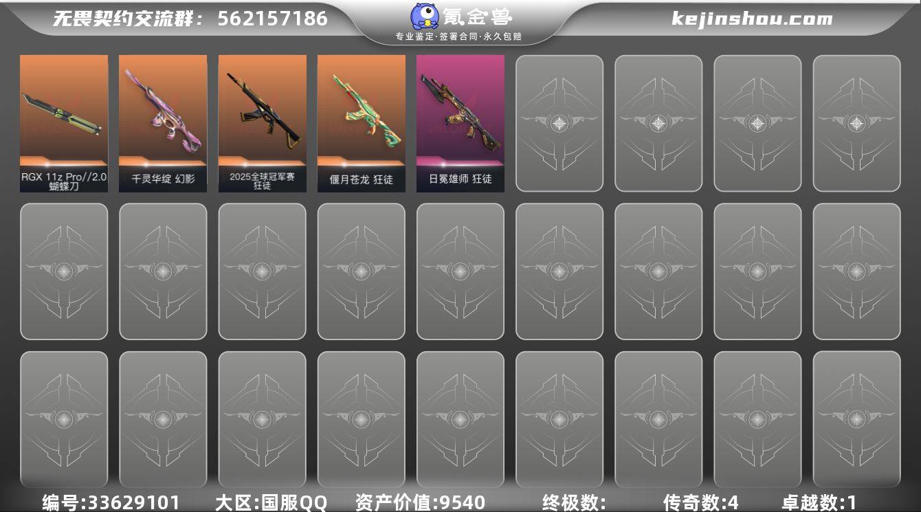 段位: 未定级 近战武器皮肤: RGX 11z Pro//2.0 蝴蝶刀 步枪皮肤: 狂徒-偃月苍龙,幻影-千灵华绽,狂徒-日冕雄师,2025全球冠军赛 狂徒 亮点: 【优质装备】:幻影-千灵华绽,狂徒-偃月苍龙,狂徒-日冕雄师,RGX 11z Pro//2.0 蝴蝶刀,2025全球冠军赛 狂徒