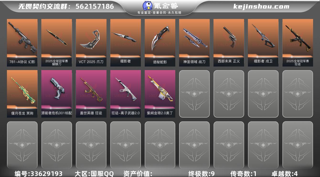 【套装】:2025全球冠军赛套装,VCT 2025 赛季套装 【英雄】:幻棱,炼狱,维斯,暮蝶,钛狐,壹决,铁臂,捷风,雷兹,幽影,不死鸟,贤者,猎枭,蝰蛇,零,芮娜,奇乐,尚勃勒,霓虹,斯凯,夜露,星礈,K/O,海神,盖可,黑梦,钢锁 【近战武器】:近战武器-2025全球冠军赛 蝴蝶刀,近战武器-VCT 2025 爪刀,近战武器-噬影者 簇刃,近战武器-诡秘蛇影 军刀,近战武器-神圣领域 战刀 【狂徒】:狂徒-2025全球冠军赛,狂徒-盖世英雄,狂徒-离子武器//2.0,狂徒-诡秘蛇影 【幻影】:幻影-781-A协议,幻影-神圣领域,幻影-末日之翼 【戍卫】:戍卫-噬影者,戍卫-月球哨兵,戍卫-折光棱晶 【獠犬】:獠犬-神圣领域 【冥驹】:冥驹-偃月苍龙,冥驹-星云暗涌 【飞将】:飞将-末日之翼 【莽侠】:莽侠-诡秘蛇影,莽侠-月球哨兵 【战神】:战神-神圣领域 【奥丁】:奥丁-紫阙金琅//2.0,奥丁-末日之翼 【判官】:判官-诡秘蛇影 【雄鹿】:雄鹿-月球哨兵 【骇灵】:骇灵-无限竞技,骇灵-星云暗涌 【蜂刺】:蜂刺-星云暗涌,蜂刺-折光棱晶 【标配】:标配-源能者危机001,标配-折光棱晶 【正义】:正义-西部未来,正义-月球哨兵 【鬼魅】:鬼魅-诡秘蛇影,鬼魅-星云暗涌 【狂怒】:狂...