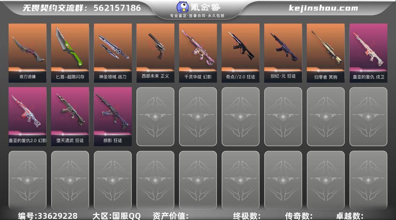 【英雄】:幻棱,炼狱,维斯,暮蝶,钛狐,壹决,铁臂,捷风,雷兹,幽影,不死鸟,贤者,猎枭,蝰蛇,零,芮娜,奇乐,尚勃勒,霓虹,斯凯,夜露,星礈,K/O,海神,盖可,黑梦,钢锁 【近战武器】:近战武器-超限闪存 匕首,近战武器-夜刃诡镰,近战武器-神圣领域 战刀 【狂徒】:狂徒-奇点//2.0,狂徒-创·纪元,狂徒-荆刺圣骸,狂徒-堕天遗武,狂徒-掠影,狂徒-耀鳞威龙 【幻影】:幻影-千灵华绽,幻影-盖亚的复仇//2.0,幻影-超限闪存,幻影-神圣领域 【戍卫】:戍卫-盖亚的复仇,戍卫-浮光跃金,戍卫-月球哨兵 【獠犬】:獠犬-神圣领域,獠犬-模拟赫兹 【冥驹】:冥驹-归零者,冥驹-模拟赫兹,冥驹-星云暗涌 【莽侠】:莽侠-超限闪存,莽侠-月球哨兵 【战神】:战神-神圣领域,战神-浮光跃金 【雄鹿】:雄鹿-模拟赫兹,雄鹿-月球哨兵 【骇灵】:骇灵-浮光跃金,骇灵-星云暗涌 【蜂刺】:蜂刺-超限闪存,蜂刺-星云暗涌 【标配】:标配-浮光跃金 【正义】:正义-西部未来,正义-超限闪存,正义-纳米打击,正义-月球哨兵 【鬼魅】:鬼魅-诡秘蛇影,鬼魅-模拟赫兹,鬼魅-星云暗涌 【狂怒】:狂怒-神圣领域,狂怒-蒙太奇,狂怒-喷火式 【短炮】:短炮-天才少女 【卡面】:终章...
