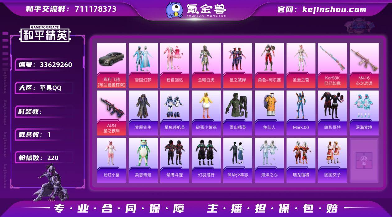1载具-150套装-220枪皮-苹果手Q-可二次-地铁满天赋-可当地铁护航男神号-冰雪全套-红眼罩-星之彼岸全套加AUG-小黄脸全套背包-1常用载具-小黄鸭鞋子-10王牌印记-6粉装-4特效枪-1载具-68387热力值-150套装-220枪皮 【6粉装】角色-圣堂之誓,套装-雪国幻梦,套装-粉色回忆,角色-阿尔茜,套装-金曜白虎,套装-星之彼岸 【4特效枪】AUG-星之彼岸/7级,Kar98K-巳巳如意/5级,Mk14-福马献瑞/5级,M416-心之恋语/7级 【4稀有紫装】Mark.06,暗影哥特,雪山精英,龟仙人 【1稀有载具】宾利飞驰(布罗德盖棕双色) 【150稀有时装】雪国幻梦,圣堂之誓,金曜白虎,阿尔茜,粉色回忆,星之彼岸,龟仙人,Mark.06,雪山精英,暗影哥特,萌趣咩咩,海上生明月,龙魂突击队,卖崽青蛙,街头风暴,冰河战士,战术大师,马上有钱,蝶变,湖畔霞光,炫彩糖果,SS35特训,SS29特训,SS31特训,SS33特训,SS32特训,SS36特训,焰鹰斗篷,暗夜傀儡,水晶王族,冰川谧蓝,福星高照,虎虎生威吉莉,夏日音浪,龙的传人,潮流炫酷,SS8特训,众神之王,智慧之神,果汁能量,萌黄之夏,SS37特训,SS28特训,萌趣绒叽,人鱼之吻,特训学院,海洋之心,红色运动,极速竞梦,飞驰魅影,音速流光,冰川格斗者,SS9特训,神秘舞者,湖蓝色名流,黄色名流,绯格组合,SS26特训,空岛之...