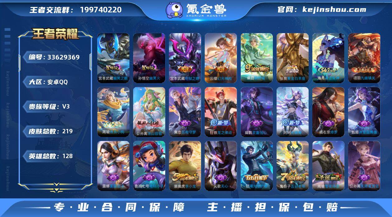 0BFWJT可二次v3"""219皮肤传说4优质限定2 钱包无法注销、信用分正常、无设备脸 传说皮肤:幻光神枪,地狱之眼,黄金白羊座,鸣野蒿, 新史诗限定:涂山容容, 史诗限定:雪夜绮愿(周瑜), 新史诗皮肤:灵蛊蚀心,百相守梦-黄忠, 优质史诗皮肤:修罗, 周年皮肤:李小龙,江河有灵,游园惊梦,梁祝,鹤鸣心笺,五谷丰年, 珍宝阁:玩趣恶龙,万物之道,蔷薇恋人, 史诗皮肤:地狱岩魂,星夜王子,圣诞狂欢,末日机甲-吕布,无心,乘风破浪,幽灵船长,功夫厨神,德古拉伯爵,心灵战警,猫狗日记-孙策,未来纪元-赵云,节奏热浪,鬼剑武藏,千年之狐,紫霞仙子,曙光守护者,原初追逐者,纤云弄巧,缤纷独角兽,金属风暴,魅力维加斯,女仆咖啡,摇滚巨星,暗夜贵公子,冰雪圆舞曲,圣诞恋歌,心灵骇客,黄金分割率,水果甜心,电玩小子,鹰眼统帅,逐浪之夏,特工魅影,无限星赏官,箭羽风息,绅士熊喵,乱世虎臣,舞动绿茵,华丽摇滚, "" " 贵族3 星传说2 传说皮肤4 史诗皮肤55 皮肤数量219 皮肤价值:129908 英雄128 永恒钻石II 总场次9836