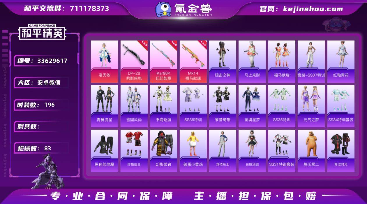 和平精英精品小号,可二次实名,干净无绑超安全! 传奇王牌14星高段位,洛天依套装(缺二级头+MG3),熊二、小鸟依猿、夏日青晴、霓虹热舞齐全,蓝冰雨、鱼渊荷华、紫幽梦多款手册皮肤,枪械皮肤83款、头盔皮肤34个、背包皮肤38个、挂件11个,还有超多皮肤,颜值高、收藏拉满,上手即玩,性价比超高,诚心出售,非诚勿扰~