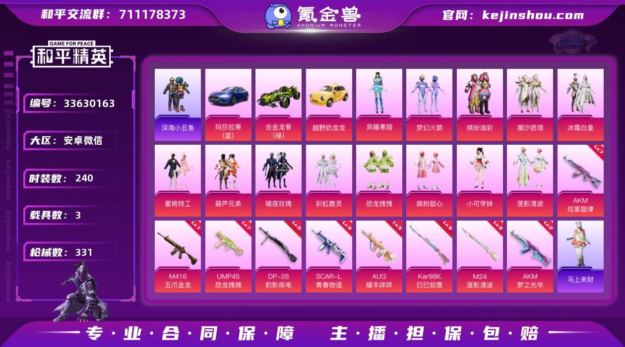 【952526】缤纷油彩!安卓 微信-13粉装-9特效枪-3载具-4粉色飞行器-108390热力值-8王牌印记-240套装-331枪皮 【热门品类】:粉装-梦幻火箭,粉装-缤纷油彩,套装-深海小丑鱼,套装-小丑鱼,角色-军刀雅典娜,套装-龟仙人,套装-潮萌小黄鸭 【粉色套装】:粉装-梦幻火箭,粉装-缤纷油彩,粉装-潮汐统领,粉装-冰霜白皇,粉装-蜜桃特工,粉装-葫芦兄弟,粉装-暗夜玫瑰,粉装-彩虹鹿灵,粉装-恐龙拽拽,粉装-飒粉甜心,角色-小可学妹,粉装-莲影清波,角色-异瞳寒姬 【粉色枪皮等级】:AKM-炫紫旋律(七级),AKM-梦之光华(二级),SCAR-L-青春物语(五级),M416-五爪金龙(七级),AUG-暖羊咩咩(五级),UMP45-恐龙拽拽(七级),Kar98K-巳巳如意(五级),M24-莲影清波(五级),DP-28-豹影疾电(五级) 【粉色载具】:玛莎拉蒂Ghibli(蓝),合金龙骨(绿),越野奶龙龙 【粉色枪皮】:AKM-炫紫旋律,AKM-梦之光华,SCAR-L-青春物语,M416-五爪金龙,AUG-暖羊咩咩,UMP45-恐龙拽拽,Kar98K-巳巳如意,M24-莲影清波,DP-28-豹影疾电 【粉色飞行器】:梦幻火箭飞行器,梦之光华飞行器,天之羽翼飞行器,万古烈焰飞行器 【粉色降落伞】:深海曼妙降落伞,甜心宝贝降落伞,梦幻火箭降落伞,龙虾霸...