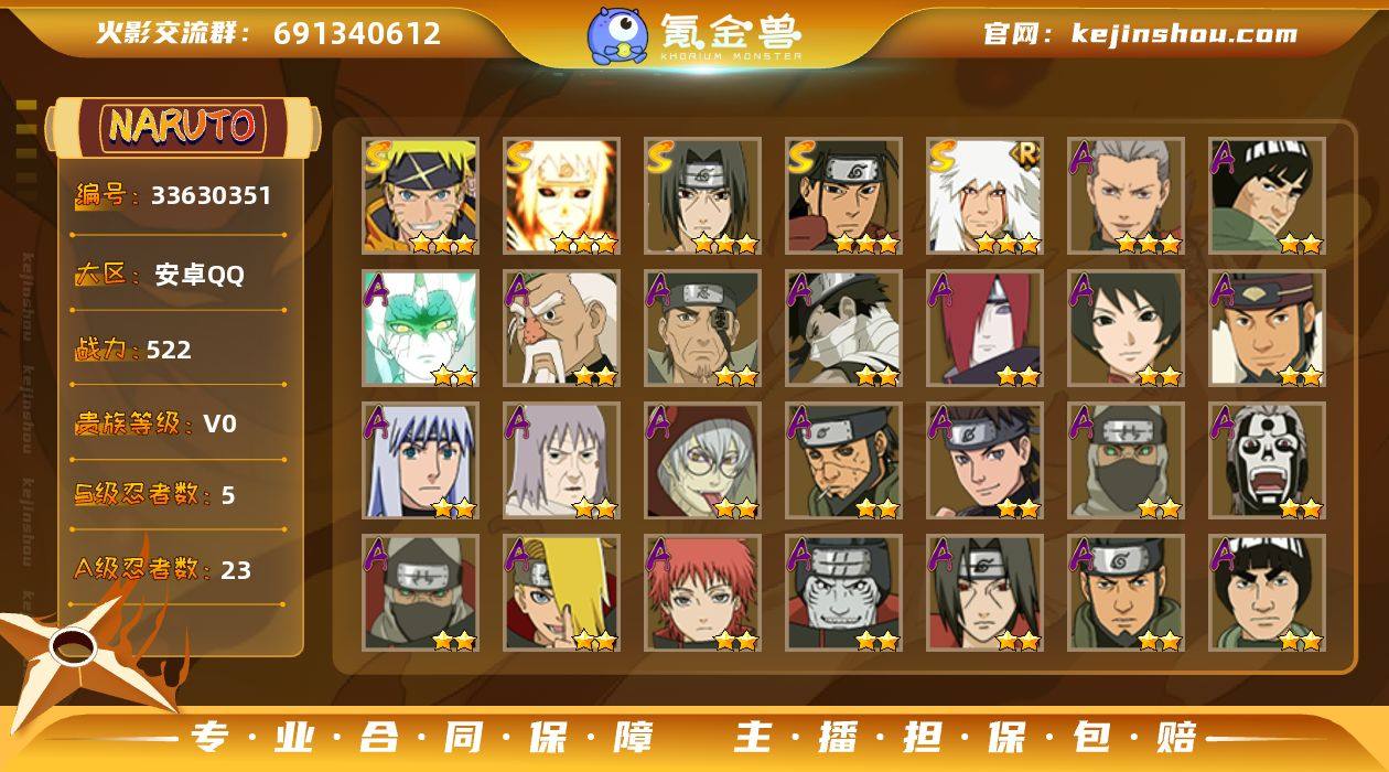 【HYF2770】VIP等级V0/战力522W/S忍数量5/A忍数量23/二星A-大野木「侠隐江湖」/三星S-波风水门「九喇嘛连结」/二星A-飞段「死司凭血」/二星A-宇智波鼬/二星A-长门「青年」/二星A-迈特凯/二星A-猿飞日斩「火影继承人」/三星A-飞段/二星A-蝎/三星S-漩涡鸣人·宇智波佐助/二星A-角都「地怨虞」/二星A-猿飞阿斯玛「秽土转生」/二星A-土台「忍界大战」/三星S-自来也「舞之豪杰」/二星A-桃地再不斩「秽土转生」/三星S-千手柱间/二星A-黑土「四代目土影」/二星A-药师兜「半蛇斗篷」/二星A-猿飞阿斯玛/二星A-加藤断/二星A-迪达拉/二星A-巳月「仙人模式」/二星A-干柿鬼鲛/二星A-迈特凯「青春爆炸」/二星A-猿飞阿斯玛「七夕限定」/二星A-千代「近松十人卫」/三星S-宇智波鼬 「须佐能乎」/二星A-角都
