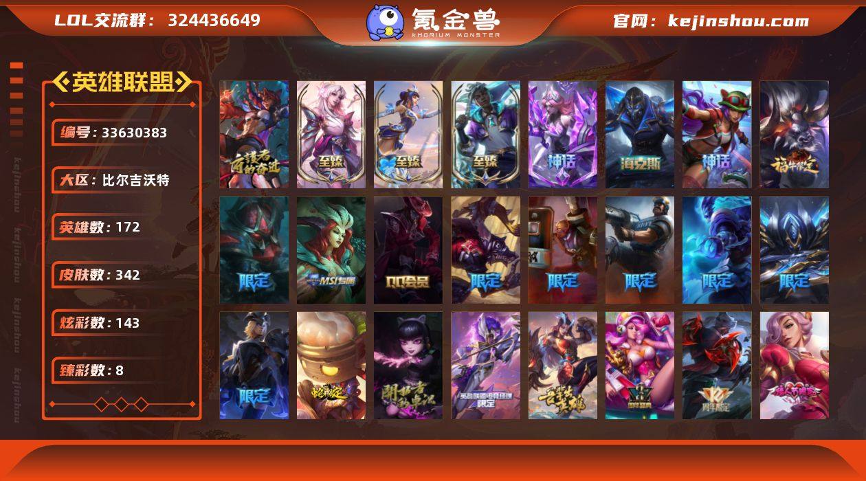 【LOLF3020】172英雄/342皮肤/1终极/7神话/50限定/8臻彩/143炫彩/40传说/60史诗/未定级/星守阿狸/十五周年纪念 希维尔/水晶圣骑 蕾欧娜/至臻 暗裔英雄 嘉文四世/至臻 青花瓷 拉克丝/至臻 灵魂莲华 拉克丝/至臻 星之守护者 艾克/海克斯 卡萨丁/无畏骑士 瑟庄妮 赤子初心/西部魔影 卢锡安 贝利尔之怠/玉剑传说 琴仙子 丁香/星之守护者 金克丝 黑洞/可爱可爱粉红红 布里茨/咖啡甜心 格温 酒醉樱桃/魔女 阿卡丽 虚荣/净雪之月 莫甘娜 冬虹/福牛守护者 阿利斯塔/点心宝贝 阿木木/穿心之剑 菲奥娜/水晶玫瑰 婕拉/冰雪风暴 希维尔/圣诞精灵 崔丝塔娜/圣诞糖果棒 厄运小姐/冰封王子 蒙多/英勇玩具兵船长/邪恶圣诞老人 维迦/圣诞玩偶 波比/圣诞老人 酒桶/魄罗骑士 瑟庄妮/圣诞捣蛋鬼 金克丝/北极星神 黛安娜/北极星发明家 塞拉斯/斗魂觉醒 莎弥拉/哥特萝莉 安妮/冠军典狱长 锤石/冠军之血 希瓦娜/冠军掠夺者 卡兹克/S1FNC 酒桶/S1FNC 嘉文四世/S6 SKT T1 奥拉夫/S7 SSG 伊泽瑞尔/S8 IG 卡莎/S10 DWG 凯南/S10 DWG 奈德丽/S11 EDG 悠米/3周年 厄运小姐/玉剑传说舞剑仙/12周年 劫/暗裔英雄 盖伦/胜利机器人 布里茨/胜利凤凰 艾尼维亚/胜利之王 泰达米尔/胜利巨口 克格莫/胜利剑圣 易/魅惑...