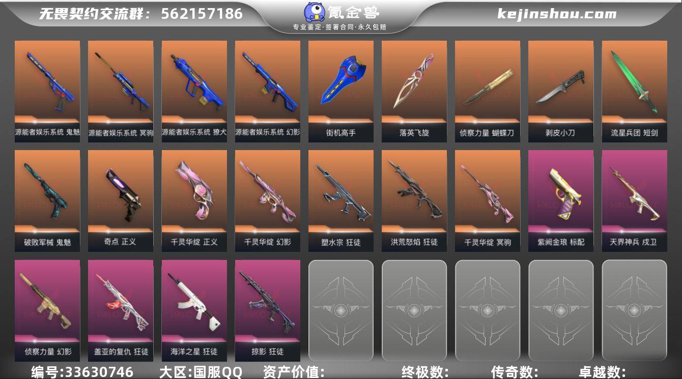 【套装】:源能者娱乐系统套装 【英雄】:幻棱,炼狱,维斯,暮蝶,钛狐,壹决,铁臂,捷风,雷兹,幽影,不死鸟,贤者,猎枭,蝰蛇,零,芮娜,奇乐,尚勃勒,霓虹,斯凯,夜露,星礈,K/O,海神,盖可,黑梦,钢锁 【近战武器】:近战武器-侦察力量 蝴蝶刀,近战武器-剥皮小刀,近战武器-落英飞旋,近战武器-珍珠棘贝 短剑,近战武器-流星兵团 短剑,近战武器-超能偶像 应援棒,近战武器-街机高手 【狂徒】:狂徒-洪荒怒焰,狂徒-塑水宗,狂徒-掠影,狂徒-盖亚的复仇,狂徒-海洋之星,狂徒-超能偶像,狂徒-流星兵团 【幻影】:幻影-千灵华绽,幻影-源能者娱乐系统,幻影-侦察力量,幻影-珍珠棘贝,幻影-聚合之力 【戍卫】:戍卫-天界神兵,戍卫-超能偶像,戍卫-珍珠棘贝,戍卫-战术熊与伙伴们 【獠犬】:獠犬-源能者娱乐系统,獠犬-采蜜小蜂队,獠犬-复古浪潮 【冥驹】:冥驹-千灵华绽,冥驹-源能者娱乐系统,冥驹-复古浪潮 【飞将】:飞将-聚合之力,飞将-战术熊与伙伴们 【莽侠】:莽侠-深海水族,莽侠-纤云弄巧 【战神】:战神-采蜜小蜂队,战神-深海水族 【奥丁】:奥丁-流星兵团 【判官】:判官-超能偶像,判官-采蜜小蜂队 【雄鹿】:雄鹿-复古浪潮 【骇灵】:骇灵-流...